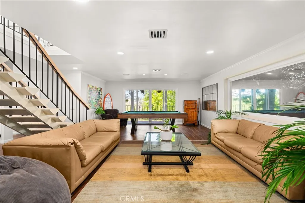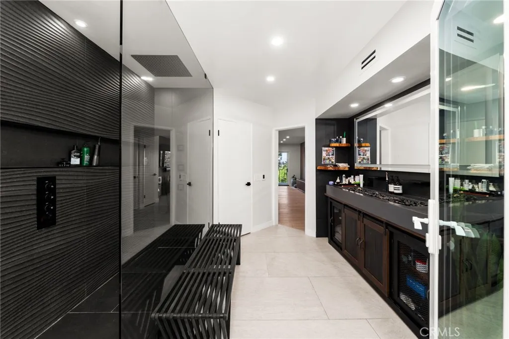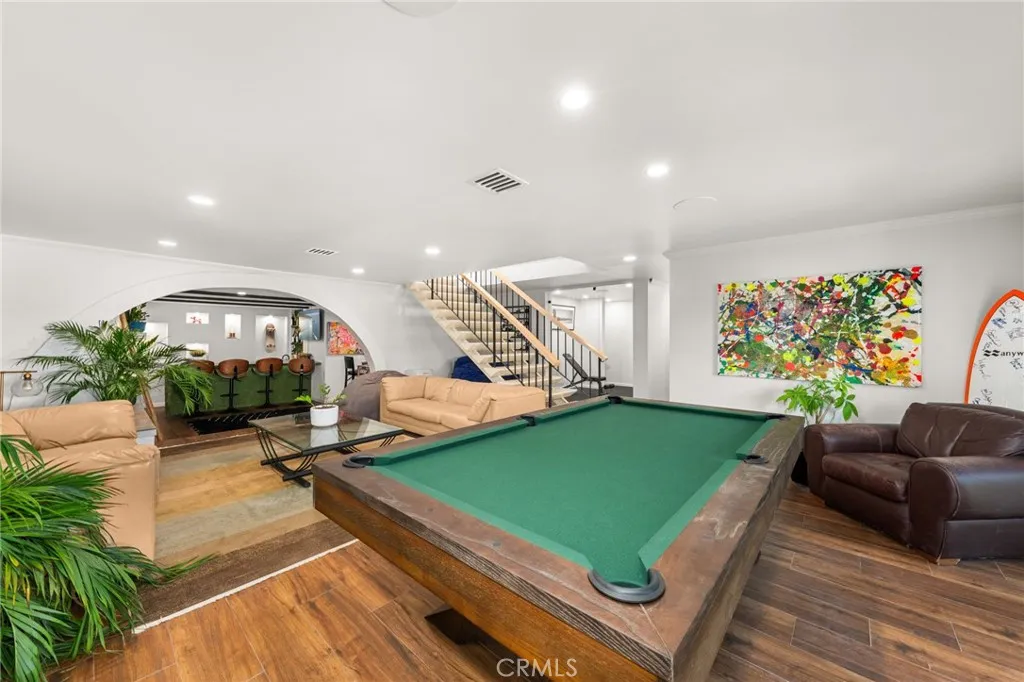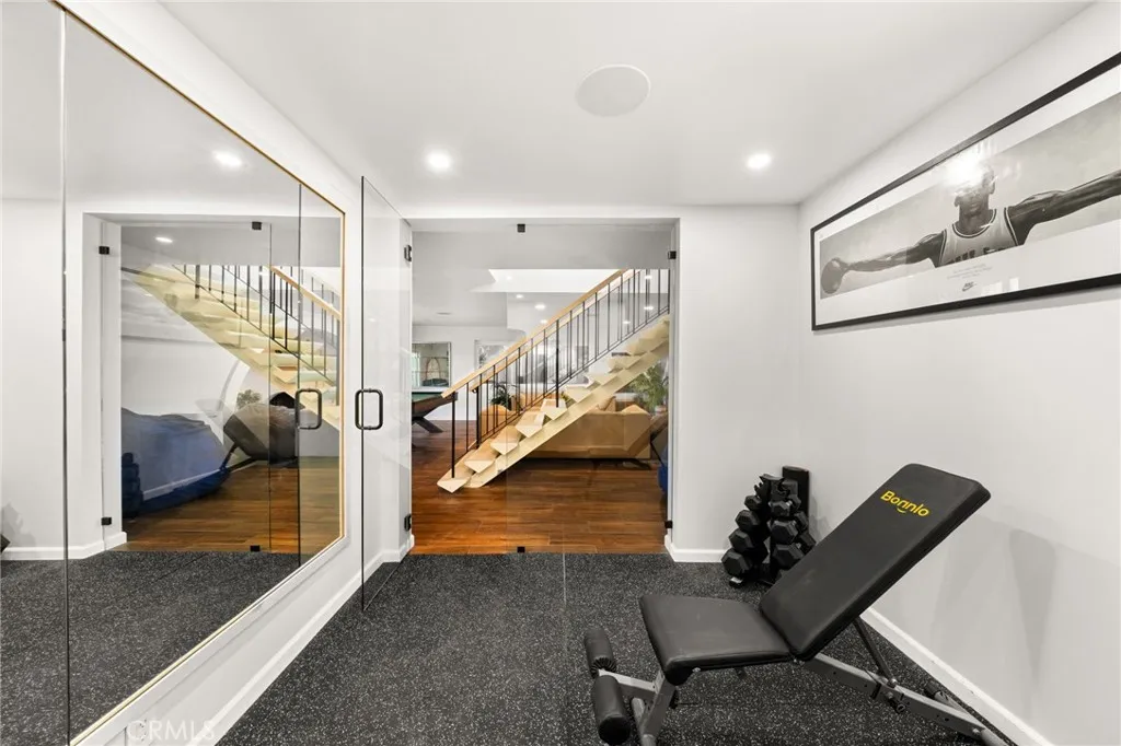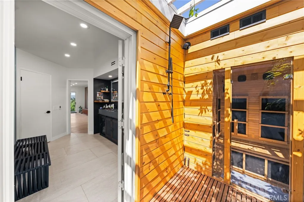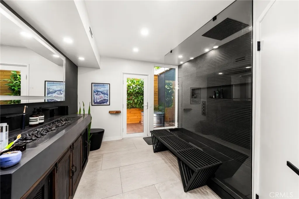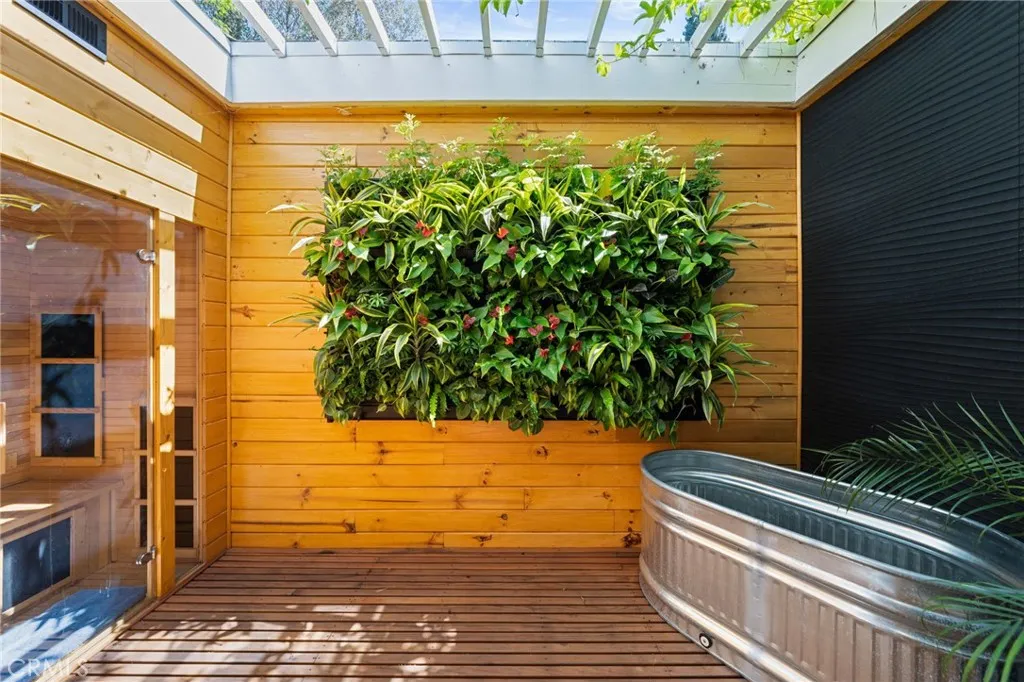 Ideal for entertaining and wellness, the lower level includes a custom bar and pool table lounge, a private gym, and a hidden office with a whiteboard wall and Murphy bookcase closet. Sonos speakers are wired throughout the home, including outdoors, where you’ll find a retreat-like backyard with a sauna, cold plunge, outdoor shower, and living green wall. The newly built outdoor living room includes West Elm furnishings, a 55” outdoor TV, and a pergola-lit hangout area.