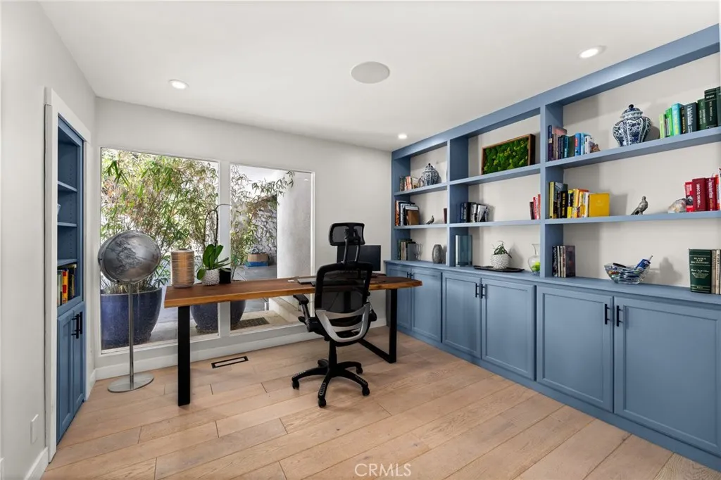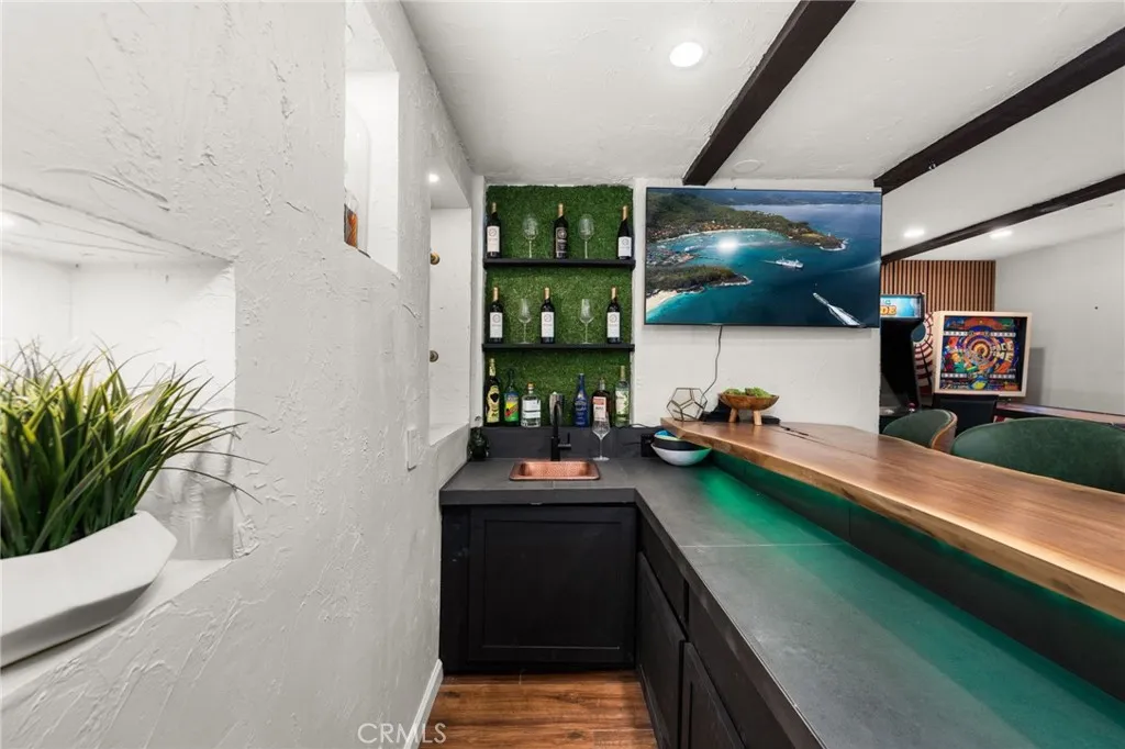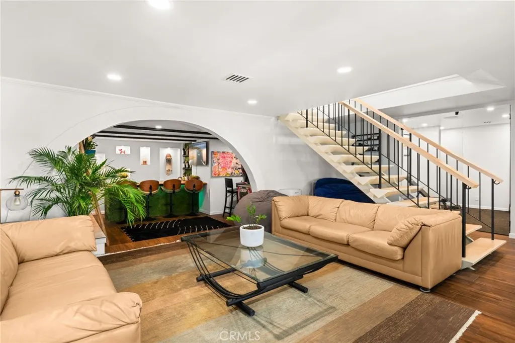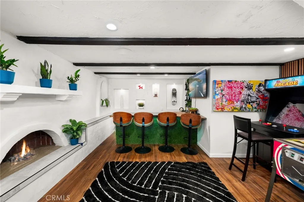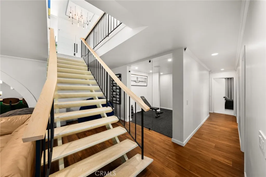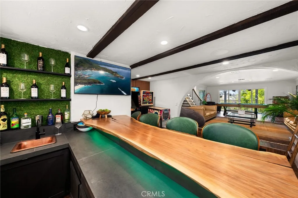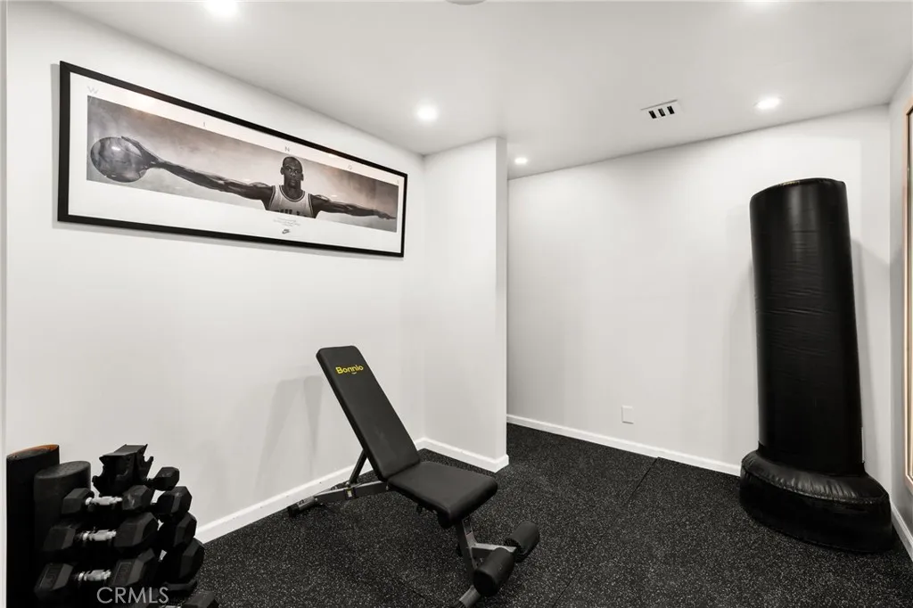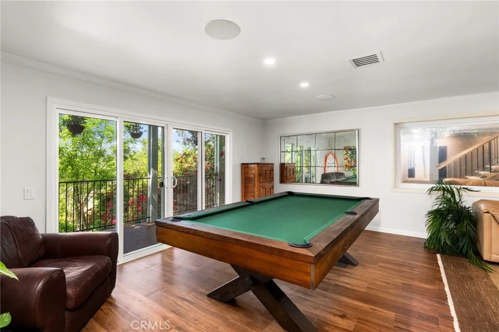 Ideal for entertaining and wellness, the lower level includes a custom bar and pool table lounge, a private gym, and a hidden office with a whiteboard wall and Murphy bookcase closet. Sonos speakers are wired throughout the home, including outdoors, where you’ll find a retreat-like backyard with a sauna, cold plunge, outdoor shower, and living green wall. The newly built outdoor living room includes West Elm furnishings, a 55” outdoor TV, and a pergola-lit hangout area.