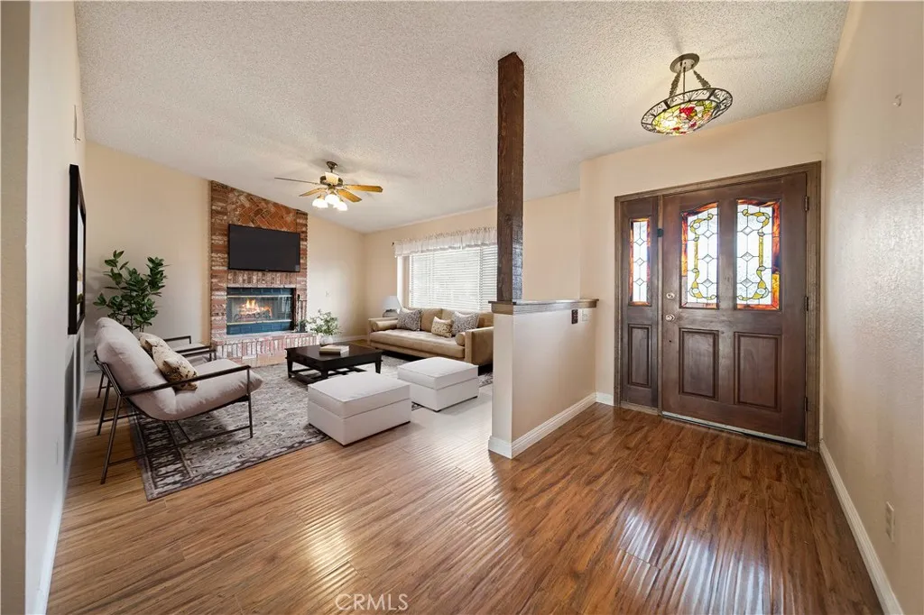 Rich wood flooring flows through the main living areas, while the bedrooms feature plush, newer carpeting for added comfort. Designed for both relaxation and entertaining, the home offers two fireplaces—one in the living room and another in the expansive family room—creating warm, inviting spaces throughout.