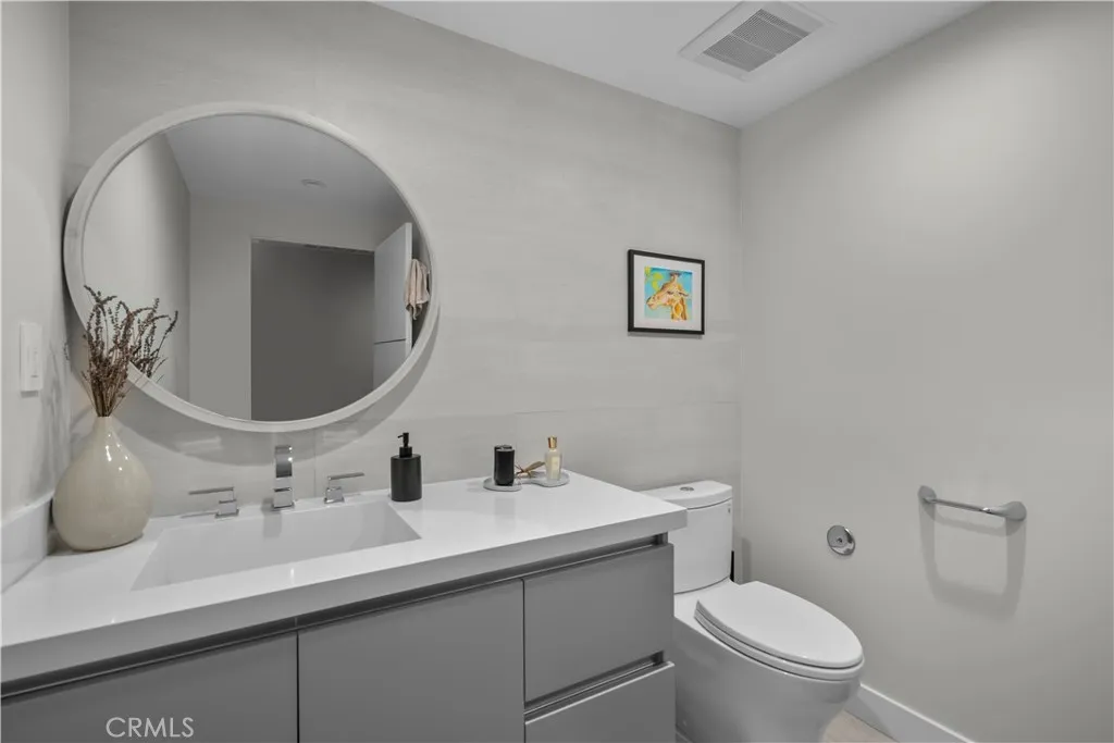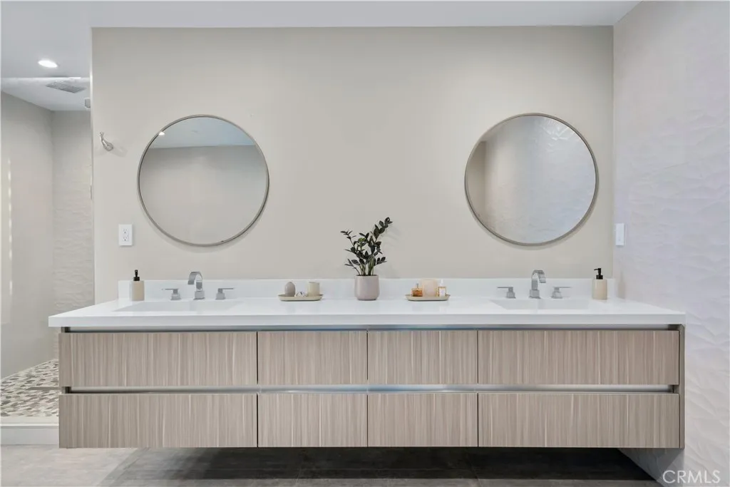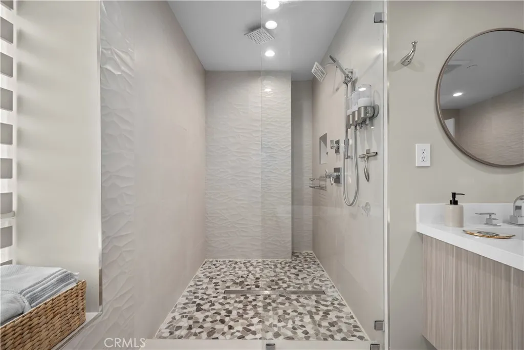 Upstairs, the primary suite is a serene retreat with a luxurious en-suite bath with soothing spa-like finishes, including a floating double vanity, a deep soaking tub, and gorgeous textured walls. The secondary bedrooms also feature their own en-suite baths and deep closet spaces with organizers.