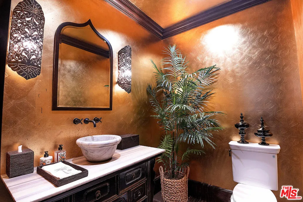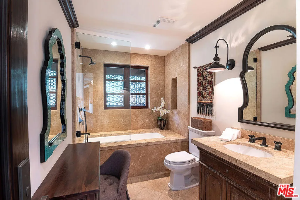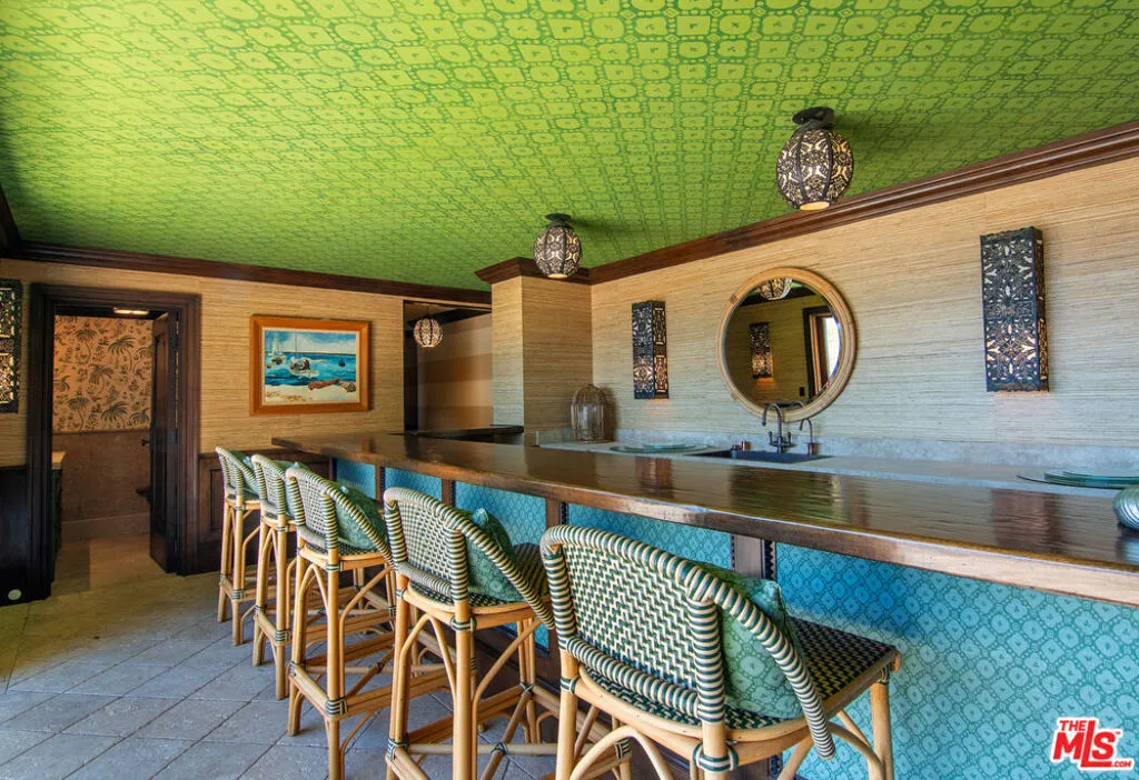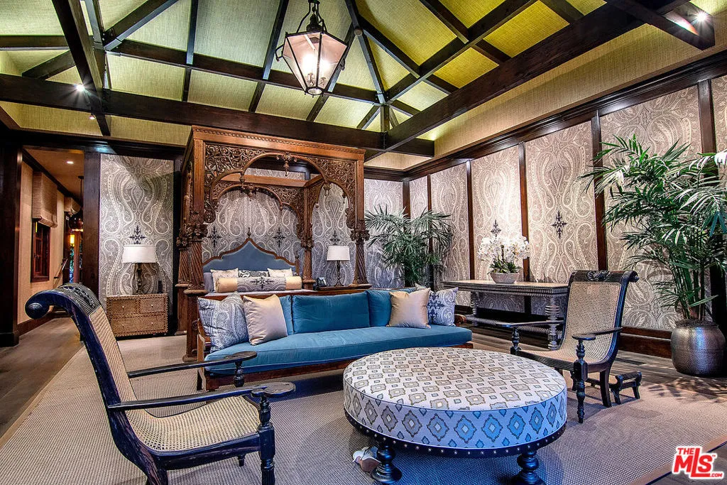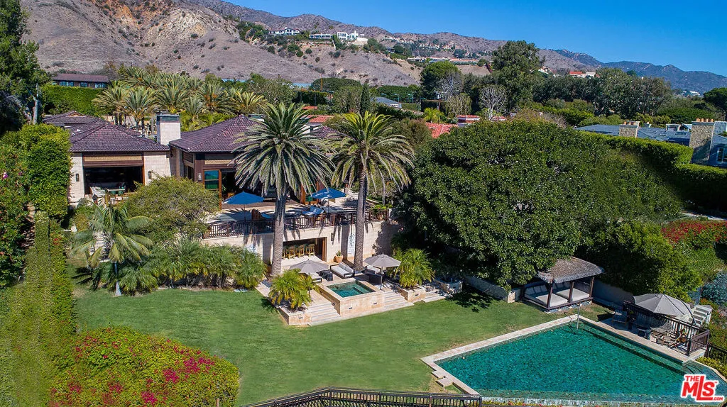 With breathtaking views, Bali-inspired design, and every contemporary comfort, this magnificent estate is a serene sanctuary for exquisite living and impressive entertaining. The private, gated property of over 1.2 acres extends from PCH to Malibu Road, perfectly landscaped and commanding expansive ocean views. A long palm-lined drive leads past a two-story, two-bedroom guesthouse, a lighted north-south tennis court and pavilion, and a fountain, waterfall, and gardens before arriving at the enormous motor court and four-car garage. A dramatic gateway and long, serene palm-lined reflecting pool lead between the wings of the U-shaped house to the gorgeous double-door entry. With interiors designed by Martyn Lawrence Bullard and stunning sight-lines to the ocean, the house is detailed with ornate wood carving, very tall beamed ceilings, wood and stone floors, and full-width exterior doors that vanish to offer seamless flow between indoors and out. The entry steps down to the formal living room, which includes a generous dining area, a pair of facing fireplaces, and a wall of glass that opens onto a roomy patio with a fireplace, stunning ocean view, and a nearby fountain and barbecue island. Adjoining the living room is a spectacular ocean-view great room that includes a family room with fireplace, dining area, and a gourmet kitchen with a huge stone-topped island with seating, deeply recessed tray ceilings, beautiful cabinetry, and a pantry. One wing of the house has two bedrooms and a laundry room. The other wing features a majestic ocean-view owner’s retreat with high wood beamed ceilings, beautiful wall coverings, wood floors, and a wide glass doorway opening to a tranquil covered patio. A hallway leads to a luxurious bath, two very large closets/dressing areas, and, at the end of the hall, a resplendent Bali-inspired library/study with high coved ceilings, a wall of built-in book shelves and cabinets, a fireplace, and doors to the patio and to a private sitting area. The home’s lower level features a party-perfect bar room highlighted with ornate metalwork that encloses a large wine storage area. The bar extends into a spacious tiered home projection theater. A long hallway leads to a second powder room, a changing room, and another bar, which opens to the lower patio, spa, sitting areas, and lawns, as well as the infinity ozone pool, patio, cabana, and private steps to Malibu Road and access to the beach/ocean. With Crestron electronics and full-house water filtration, this remarkable estate is a livable legacy.