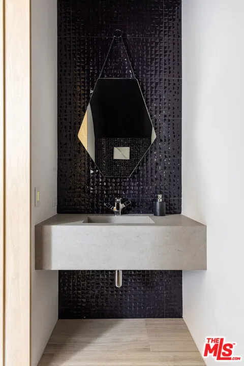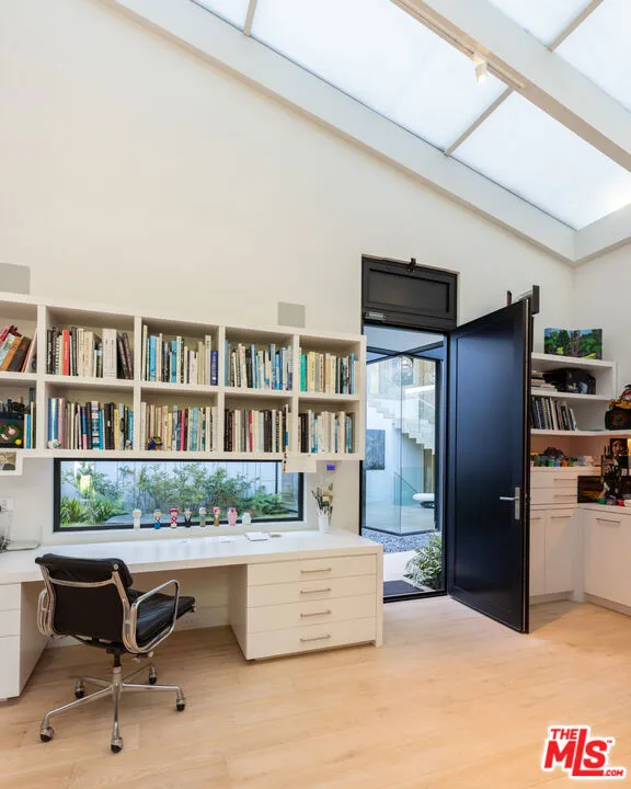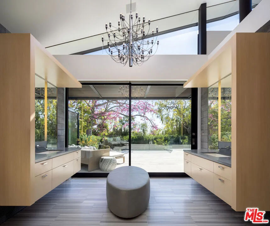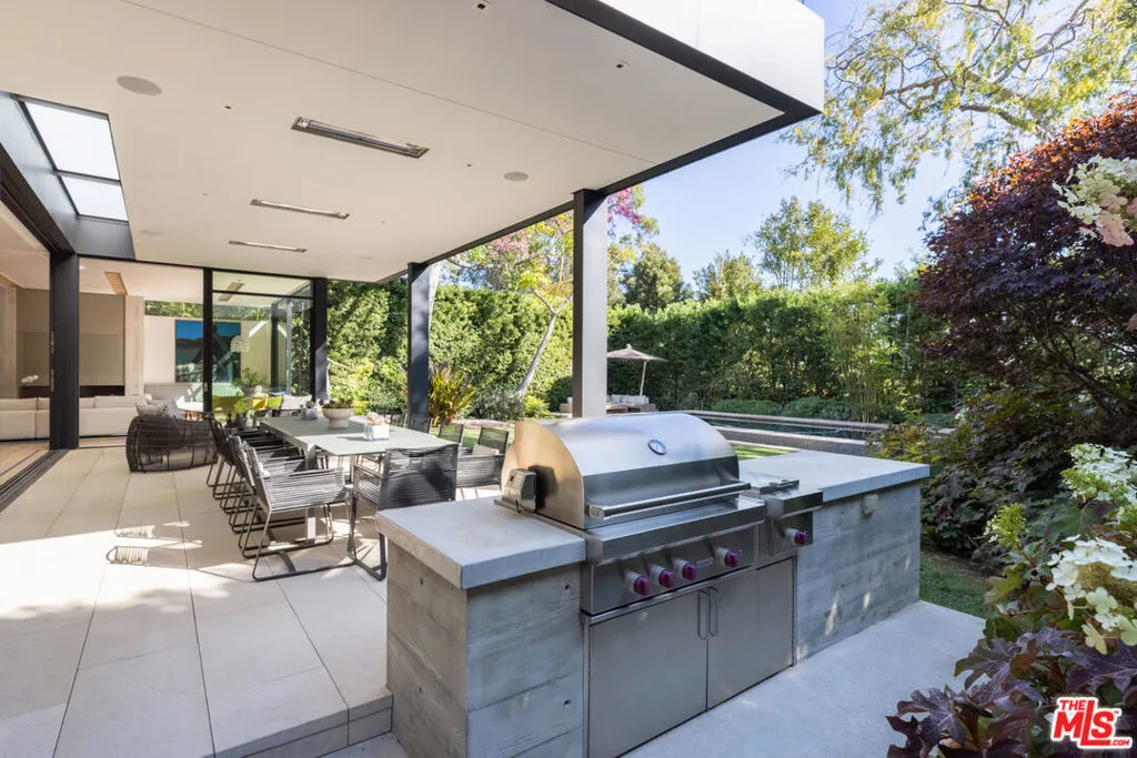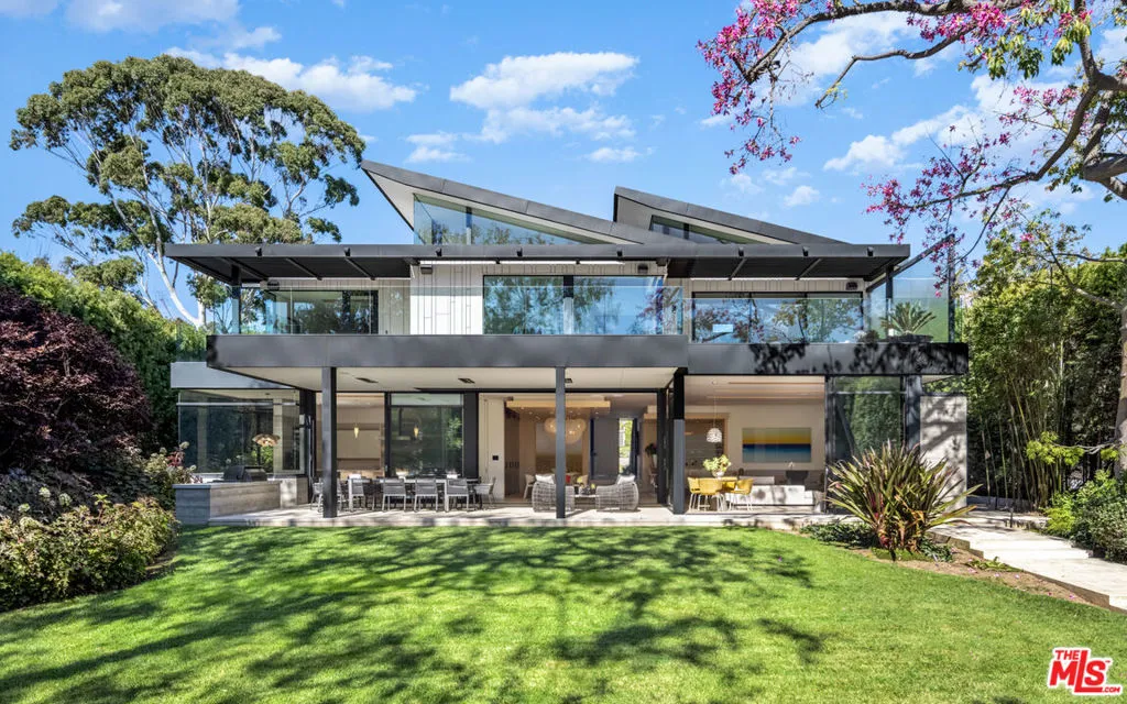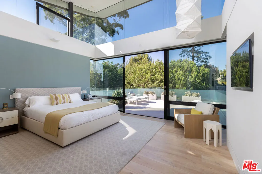 Welcome to the Flight House, a timeless Palisades Riviera architectural designed by the widely published, highly acclaimed William Hefner. A masterful fusion of high-quality materials with nods to all of earth’s basic elements, this thoughtfully crafted modern marvel arrests the senses on approach. Meticulous landscaping contributes to an overall sense of calm. Warm light glows through large metal-framed walls of glass converging with smooth concrete for added contrast behind the surrounding greenery. Inside, the foyer is itself a work of art, with an accent wall of varied vertical lines illuminating the entry as globes of glass dangle overhead. Soft floor tiles mimic the wood grain of the minimalist glass-sided staircase. A refreshingly delightful powder room welcomes visitors with a dazzling display of light reflecting off of textured walls. Beyond, the living room is centered by a commanding yet reserved fireplace flanked by plush built-in seating and clerestory windows bringing natural light in. To the left, a perfectly positioned wet bar offers plenty of room for entertaining guests. Nearby, a temperature-controlled wine enclosure separates the open-concept formal dining area from the state-of-the-art kitchen. The culinary center of the home features multiple prep spaces and built-ins including butler’s station and writing desk, a large center island with secondary prep sink and bar seating, glossy cabinetry, top-of-the-line stainless-steel appliances including Wolf cooktop with hood, quartz countertops, and built-in breakfast nook. Massive Fleetwood doors envelop the interior spaces, opening to provide seamless transition to the rear patios perfect for relaxing under the stars or dining al-fresco. Upstairs, the voluminous primary suite is the true prize of the home, with partial ocean views, a vaulted ceiling, sitting area, fireplace, and architecturally important clerestory windows bathing the space in light. The primary bathroom offers dual floating vanities, spa-inspired shower, and a dressing room to rival most department stores. Fleetwood doors access a private balcony which spans the entire rear of the home, overlooking the grounds below. Secondary bedrooms also include their own private patios for the ultimate indoor/outdoor lifestyle, and a front balcony can be found just outside the upstairs guest bedroom. Additional amenities include a three-story elevator, fully insulated safe room, theatre, gym, office, zen gardens, and studio/guest house. The rear yard is secluded by lush greenery and includes a pool with infinity waterfall edge, lounging deck, built-in barbecue, and plenty of grass to roam and play. This serene residence is currently being utilized as three bedrooms plus guest house but can be reconfigured as five bedrooms plus guest house. Welcome to this one-of-a-kind sanctuary just moments to Palisades Village, Malibu, beaches, and all of the plentiful shopping, dining, and entertainment Santa Monica and the Westside have to offer.