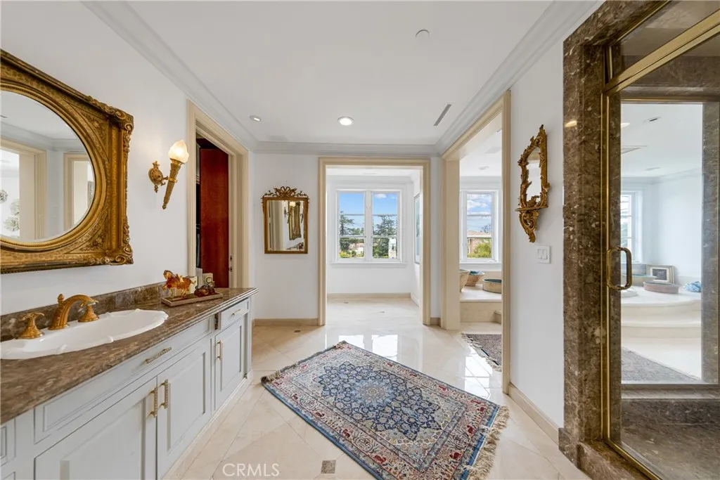 Upstairs, there is a spacious primary suite with private sitting area, dual bathrooms and closets, two connecting bedrooms, and five additional en-suite guest rooms—many with balconies or terrace access.