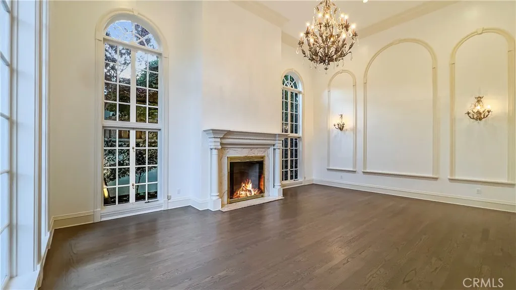 The grand two-story entry, featuring a sweeping staircase and skylight, sets the stage for elegance. The formal living room, with its stunning fireplace and Palladian windows, exudes sophistication, while the richly paneled oak library with walnut floors offers a cozy retreat. The inviting family room seamlessly opens to the pool area and beautifully landscaped gardens, perfect for indoor-outdoor living.