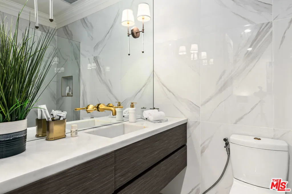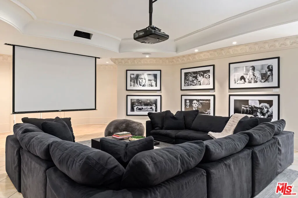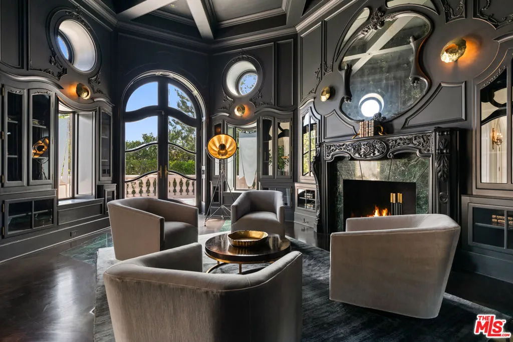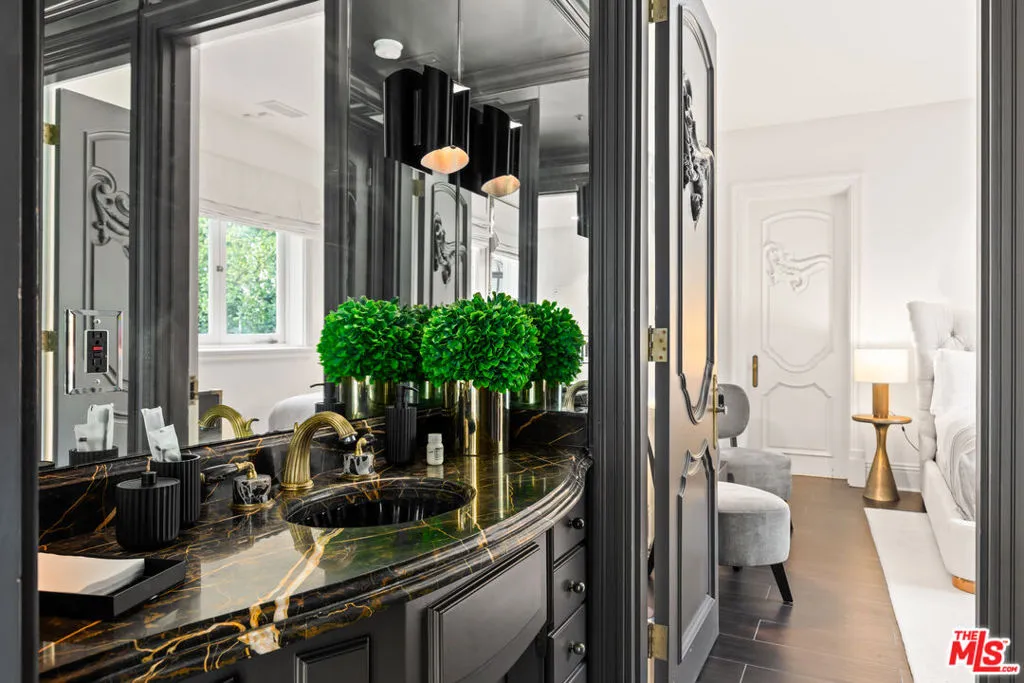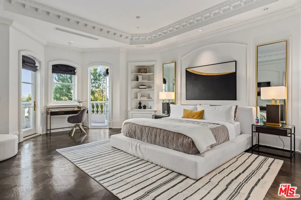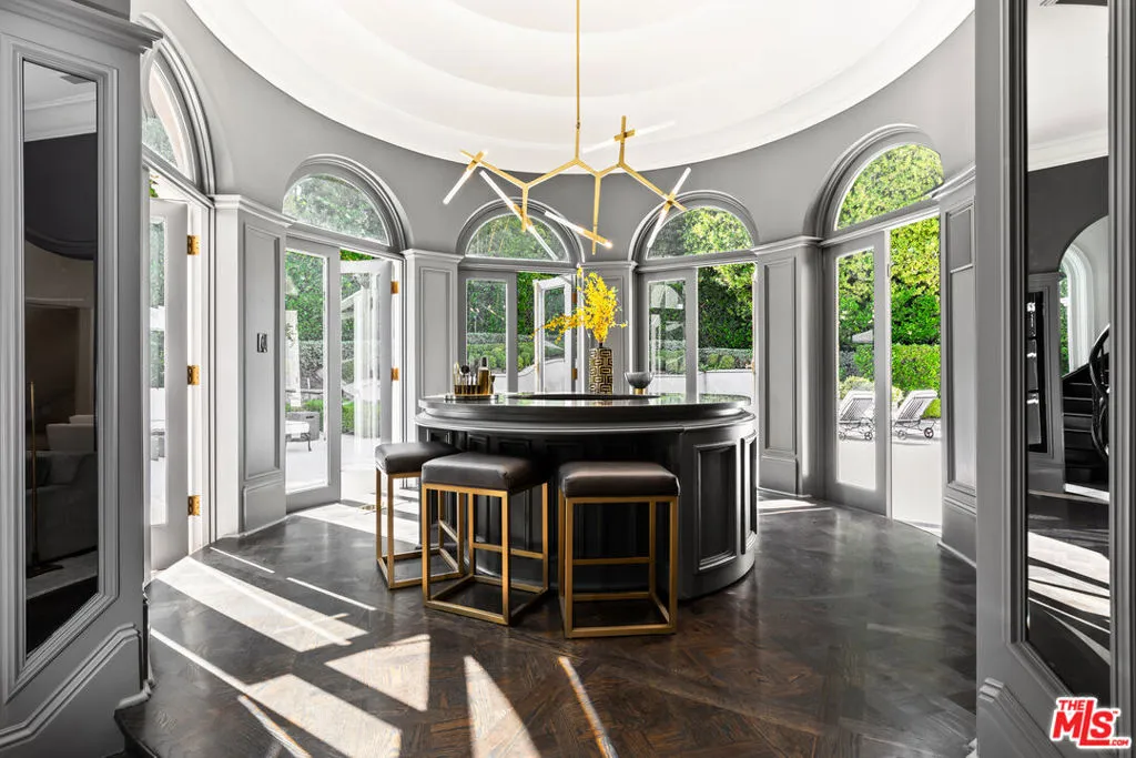 This stunning private estate, located in the prestigious city of Beverly Hills, combines timeless classical architecture with sleek contemporary interior design. Enter through grand double doors into an impressive foyer featuring soaring 30-foot ceilings and a striking bronze dual staircase, leading to a seamless indoor-outdoor layout. The formal rotunda entrance sets a tone of elegance, inspired by the refined style of the Peninsula Hotel in Paris. Blending European architectural elements, this home is a masterpiece of craftsmanship and detail.With 8 bedrooms, 12 bathrooms, and an array of formal spaces including family, living, and dining rooms with fireplaces, along with a library, bar, and media room, the estate is designed for both luxury and comfort. The custom-designed kitchen, created by Martin Pierce, includes a butler’s pantry and top-of-the-line appliances. The master suite features dual bathrooms, spacious walk-in closets, and an attached private office.The impeccably landscaped grounds are an oasis, featuring a cascading pool, spa, shaded seating areas, and vibrant gardens. Ideal for hosting large gatherings, the property also offers a warm and welcoming atmosphere for intimate family living.