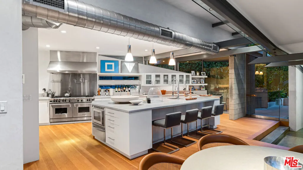 Ocean views, lush natural light, and dramatic angles animate the spacious interiors of this spectacular architectural estate. Designed by renowned architect Bart Prince in a series of interconnected modules, the home follows the contours of a gently terraced gated property of over an acre. With a guest house, pool, expansive landscaped grounds, and Riviera 3 beach key, this singular residence is an entirely original Point Dume retreat. The generous use of structural steel, soaring ceilings, walls of glass, polished concrete floors, and lustrous wood create welcoming spaces that seem to erase the boundary between indoors and out. Contemporary lines and exceptional layout provide settings for comfortable living and inspired entertaining. Two living rooms, a family room, and a dining room with a fireplace all offer tantalizing views of the very private grounds, where patios and gardens suggest congenial gatherings, barbecues, and undisturbed relaxation. The kitchen is a majestic achievement, with maple floors, granite countertops, top-of-the-line built-in appliances, a large island with bar seating, a built-in desk, and a butler’s pantry / catering kitchen with additional appliances and a door to the side yard. An en-suite bedroom/gym/office with backyard and pool views completes the main floor. On the upper floor, where rooms are connected by a long catwalk, there is an ocean-view office with a fireplace, plus three en-suite bedrooms, including the primary. This lavish private getaway has very high ceilings and stunning pool and ocean views, plus walk-in closets and a sublime ocean-view bathroom. In addition to the main house, there is a one-bedroom guest house with a living room and a full kitchen. At the front of the house, there is a lush, private yard with ample space for relaxing and entertaining. The grand-scale ocean-view backyard offers a variety of settings for outdoor dining and lounging, including a covered dining deck, an outdoor living room, a large fireplace, lawn, sauna, large swimming pool, and ocean-view pathways that meander among a fruit orchard with private steps that descend to the beach below. The gated property is served by two driveways, one leading to the four connected, glass-door garage bays, one with a full bath. Additional features include seven-zone climate control and air conditioning, heated concrete floors, and security system. This is a remarkable architectural estate of bold design in a marvelous setting.