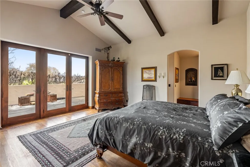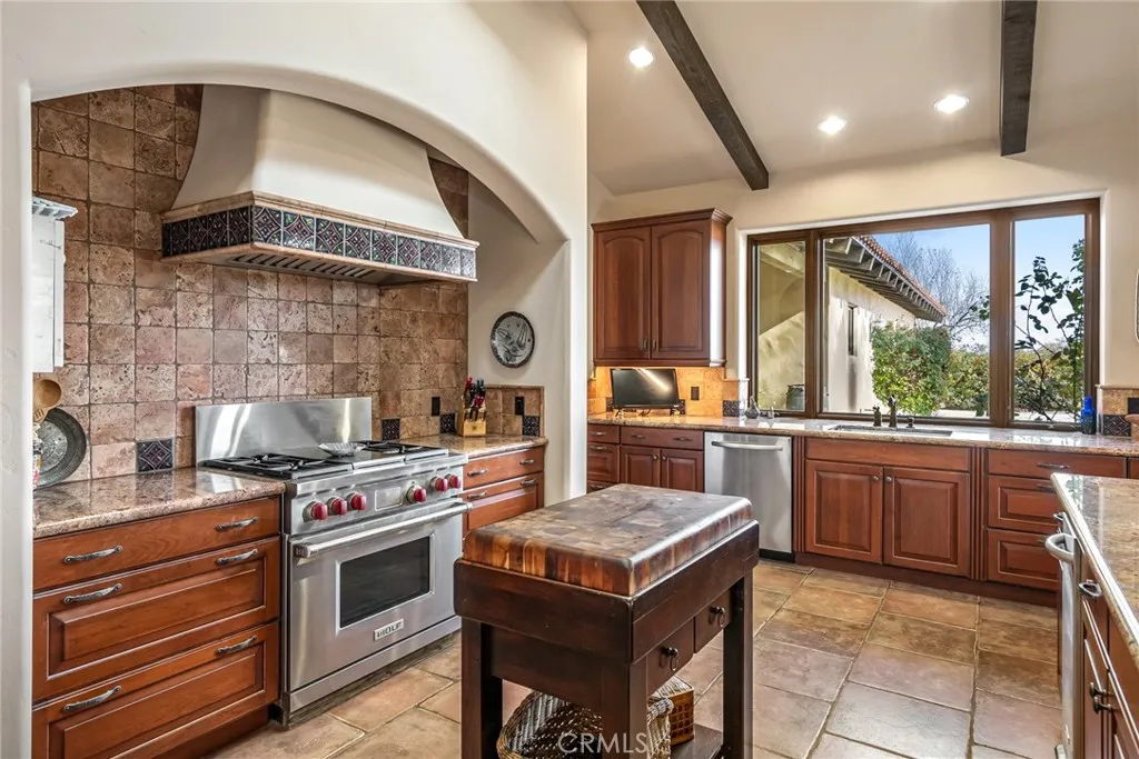 The grandeur of the custom-built Main Home Estate unfolds with impeccable design and meticulous craftsmanship evident from the moment you step inside. Boasting 3,060 +/- sf, 2 bedrooms, 2 bathrooms, plus an office, this residence features an open and spacious floor plan with high open-beamed ceilings, wooden beams, ceramic tile, and hardwood flooring throughout. The chef’s dream kitchen, complete with granite countertops, high-end appliances, a walk-around pantry, and a center island with bar seating, is ideal for entertaining. The living area, adorned with a beautiful wood-burning fireplace and built-in wood storage, creates a cozy ambiance on chilly evenings. The primary suite offers access to the back balcony, and the primary bathroom includes a walk-in closet, two vanities, a walk-in tile shower, and a wall gas stove. A covered breezeway leads from the kitchen to the 2-car garage, housing a finished, temperature-controlled wine storage room and a laundry room.
