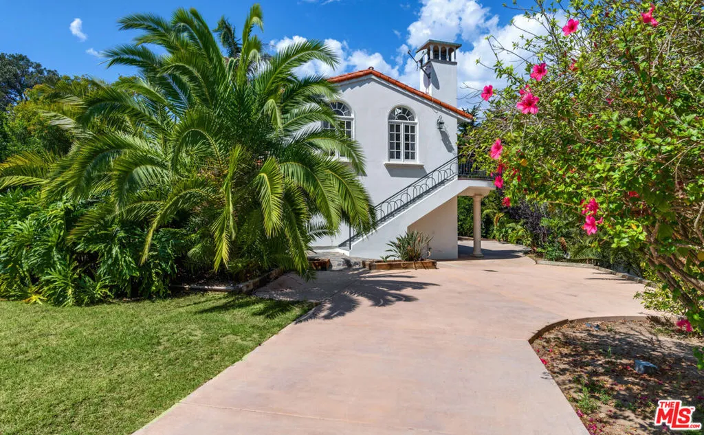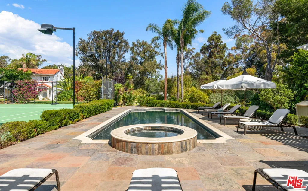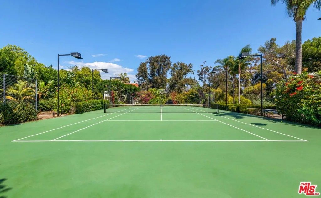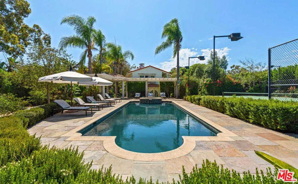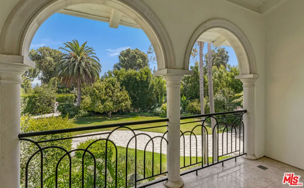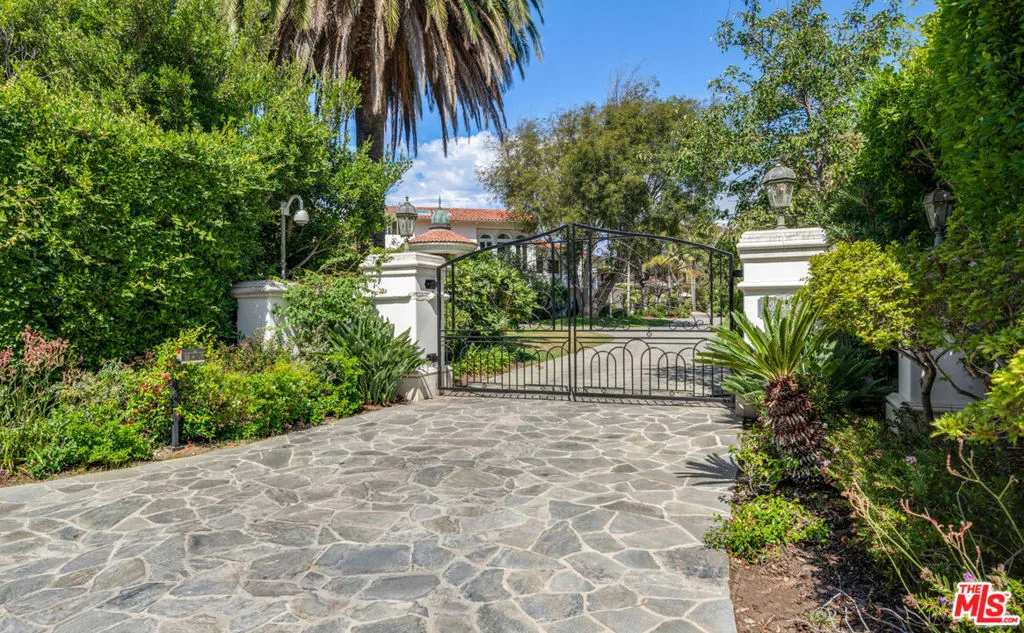 This gorgeous, resort-style Mediterranean estate is elegantly updated and meticulously maintained for a lifestyle of luxurious comfort includes beach rights to private sandy coves just minutes away. In a garden setting of more than 1.3 acres, this very private, quiet residence is both serene sanctuary and entertainers delight. Exceptional detailing creates an atmosphere of elegance highlighted by vaulted ceilings, arched doors and windows, wide-plank hardwood floors, and abundant views onto luxuriant landscaping. With dual gates offering convenient access, the home is surrounded by expansive lawns and manicured grounds, including numerous tall palms and fruit trees. From the front drive, symmetrical double staircases lead up to the pergola entry and soaring art-glass front doors. The welcoming foyer steps up into a grand-scale living/dining great room, complete with high, coffered ceilings, skylights and clerestory windows, a wide stone fireplace, built-in display shelving, and lustrous wood floors. From the dining area, French doors open into the chandelier kitchen, which has skylights, black granite countertops, stainless appliances, bar seating, and a bright, spacious breakfast room with huge windows and French doors to a wraparound balcony. Adjacent to the kitchen is a large family/media room, a bedroom, and a full bath. A hallway off the living room leads to the elegant owner’s suite, which has a fireplace sitting area, two balconies, a huge dressing area and a vanity that could be a private writing desk, plus a stunning green marble bath with dual fixtures. Just outside the owner’s suite, a staircase leads to a loft with a Juliet railing overlooking the living room. This lovely space, which could be an office or sitting area, opens to another balcony. On the home’s lower floor, there is a huge entertainment room with built-ins, a wet bar, and doors to the backyard, plus an enormous temperature-controlled wine cellar. There are four additional bedrooms on this level as well as a laundry room. The resort-like grounds feature a sunken patio with an outdoor kitchen/barbecue and dining area, a beautiful pool and spa with generous deck space for lounging, and a lighted north/south tennis court. The drive from the front of the house leads all the way through the property to the very private guest house, which sits among verdant plantings. The lower level of this two-story structure is a large gym with hardwood floors, mirrored walls, recessed lighting, TRX hookup, and a kitchenette. There is also a laundry room and a full bath. On the upper level is a skylight living/dining room with a large fireplace, windows on three sides, plus a kitchenette and a spacious bedroom suite with a private balcony. The estate has a three-car garage, plus ample guest parking. This remarkable property, exquisitely updated, offers Point Dume living at its most luxurious.