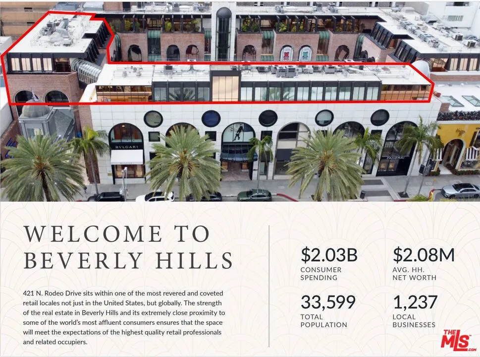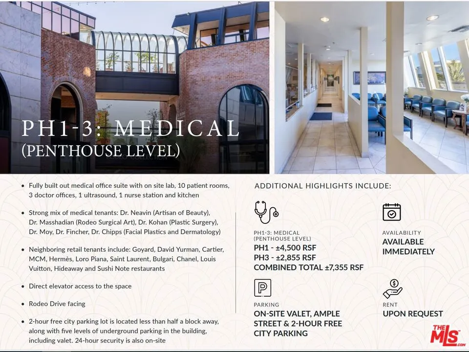 P-1 Grey Shell- Space is Demoed. This is a great location in The Rodeo Collection on the Penthouse level with spectacular city views, courtyard views and Rodeo Drive views. This suite has not been offered for over 20 plus years. Penthouse 1 P-1 $54k Per Month. $12 sq per foot 4500 SQFT. This space would be great for any retail, office, or medical business (zoned medical currently). Showings by appointment. If you need more space, you can combine this with P-3 2855 SQFT $34,250 per month for a total of $88,260.00 for a combined total of 7355 Sq Ft. If you want the space built out call Teena for more details. Showings by appointment. Call for more details Teena Anderson 310 499 3765 Valet Parking Parking is handled through Hodes Parking and Rates are $250 per month unassigned and $525 for assigned. Tenants clients in the building will only pay max $18 per day with validation and medical clients max $15 per day. Parking for all others is $3.00 per 12 mins and $30 flat rate all day. Agent Remarks: Ready ASAP Looking for a long-term tenant.