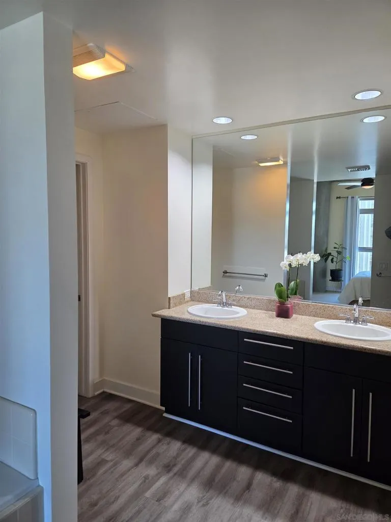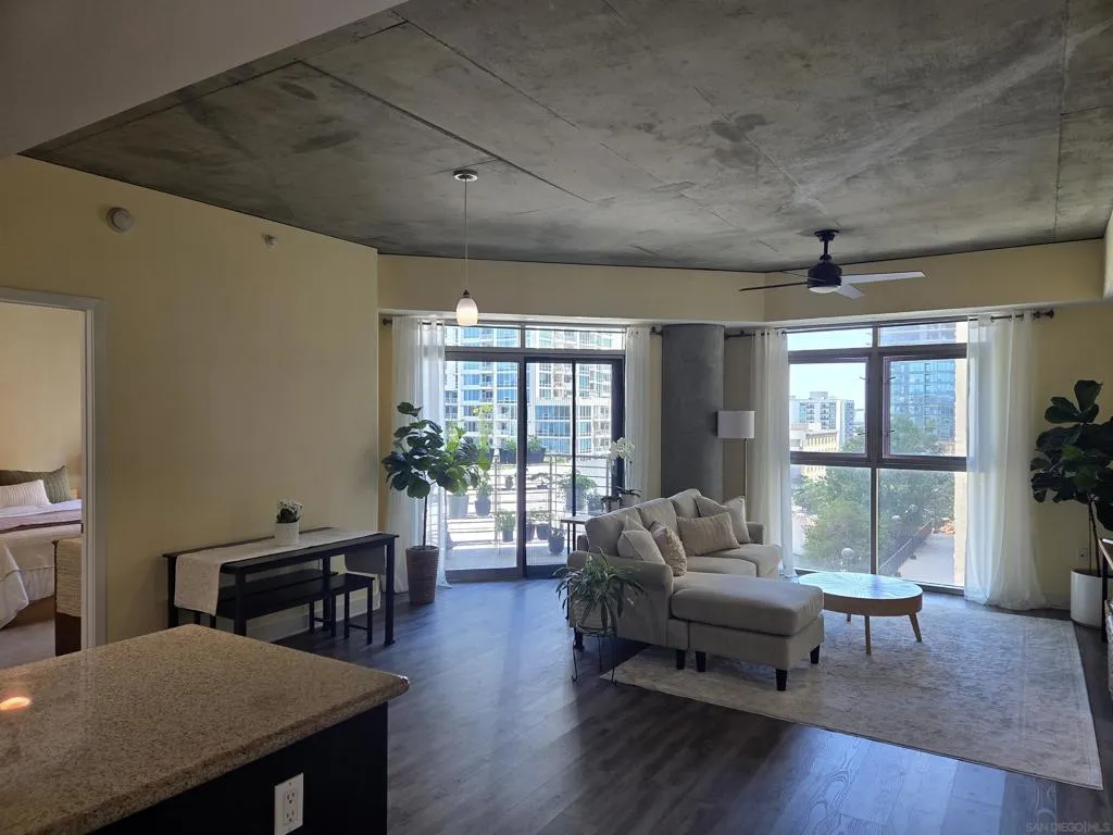 This beautiful, spacious and light-filled condo is located in the very walkable neighborhood of Cortez Hill, conveniently located on a hill in the northeast area of downtown with jacaranda lined streets, in the highly sought after Cortez Blu building! Cortez Hill is located within walking distance of Balboa Park, south of Banker’s Hill and east of Little Italy. Enjoy the city views from your private balcony or through the floor to ceiling windows in every room. There are newer, beautiful luxury vinyl tile floors throughout the main areas of the condo with carpet in the large master bedroom and second bedroom. The soaring cement ceilings and expansive windows compliment the gourmet kitchen with newer appliances and a large pantry. The kitchen flows freely into the expansive and open living spaces. The master bedroom has a large walk-in closet, en suite bathroom with dual vanities, a luxurious soaking tub as well as a separate shower. The second bedroom is a nice size with large windows and there is a second full bathroom close by, as well as a full size washer and dryer. The concrete ceilings and floors also provide a very quiet space for you to enjoy. There is one dedicated parking space, plus, for residents of Cortez Hill, additional permitted street parking is available for a $15 annual fee! Cortez Hill is a compact downtown neighborhood and is home to family-friendly restaurants, hotels and condo buildings. including the landmark El Cortez, a 1927 grand former hotel. St Joseph Cathedral dates from 1875 and features Mission Revivial-style architecture. Dotted with benches and whimsical birdhouses, Tweet Street Park is popular for strolls, while the sprawling and beautiful Balboa Park with its numerous museums and other attractions lies just to the north.