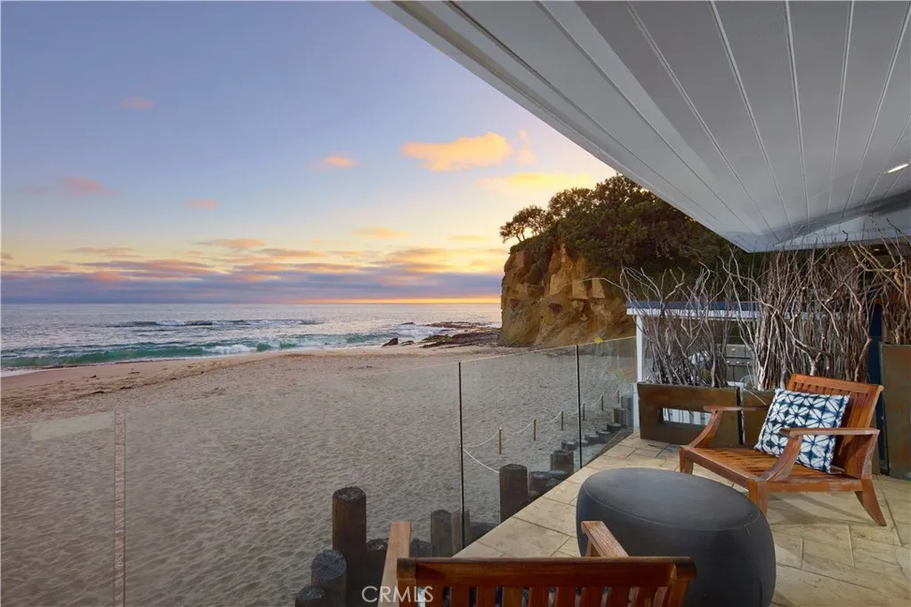 This extensively upgraded main home features four bedrooms and four baths and retains elements of its original 1963 charm. Large ocean-view windows, open living spaces, and vaulted tongue-and-groove ceilings honor the home’s mid-century roots while blending seamlessly with today’s most sought-after features. From relaxing with friends to hosting grand celebrations, the main home impresses with unobstructed views of whitewater, Catalina Island, sunsets, and sparkling evening lights. The great room serves as the heart of the home, highlighted by a dramatic modern fireplace with natural stone and bold angles. Slide-away glass doors open to a deck overlooking the beach, creating seamless indoor-outdoor living. The adjacent kitchen and dining areas also showcase ocean vistas, with the dining room taking center stage in a picturesque bay-window setting. The kitchen is equally functional and stylish, featuring white cabinetry with glass uppers, waterfall-edge countertops, two bars, and high-end appliances—perfect for entertaining or everyday meals. The primary suite on the main level opens to the central patio and boasts a luxurious bath with a jetted tub and oversized shower. A secondary primary suite on the lower level is paired with a living area that includes a walk-in wet bar, adding flexibility and privacy. Beyond the main home, a spacious and private terraced patio separates the sand-level residence from the upper-level guest homes. Perfect for outdoor entertaining, the patio features a built-in BBQ island, a fireplace, and ample space for gatherings. Offering a rare combination of privacy, luxury, and timeless design, this extraordinary property invites you to embrace the beauty and tranquility of coastal living at its finest.