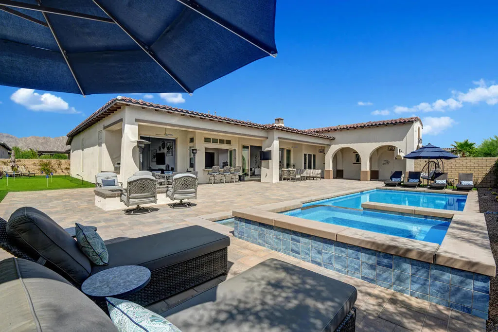 Brand new listing! Welcome to your spectacular dream vacation home located in the prestigious Griffin Ranch gated community. Prepare to be immersed in total luxury and relaxation in this beautiful resort oasis boasting a spacious open layout with over 4,150 sqft that harmoniously balances contemporary design with traditional comfort. Entering through the front gate you’re immediately transported to your own vacation paradise. The massive courtyard greets you with custom pavers, large Pebble Tec salt water pool and spa, misting system, 2 TV’s, heat lamps, built-in BBQ, mini fridge, 8-seat outside dining table, 6 lounge chairs, 2 lighted umbrellas, and a large conversational sectional. The huge firepit is perfect for cozying up on those cool desert evenings, or you can make your own tee time with the lighted 5-hole putting green. There is also an additional outside lounging area off the den with a firepit and beautiful mountain views!Bring the outside in with 10 foot tall, 22 foot wide double sliding glass doors that open the living room to the courtyard creating the ultimate indoor/outdoor living experience. Too many amenities to name, this home won’t last! Currently available April – September. Rate varies, discounted rates for summer rentals.