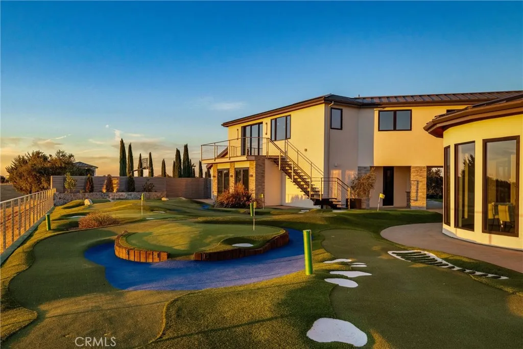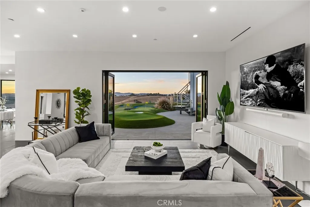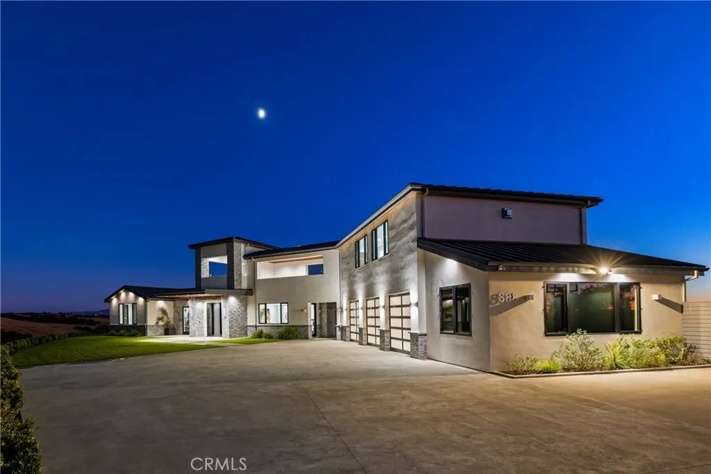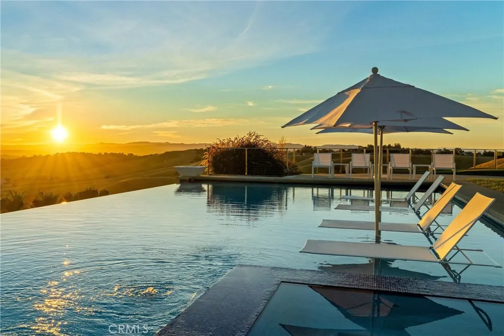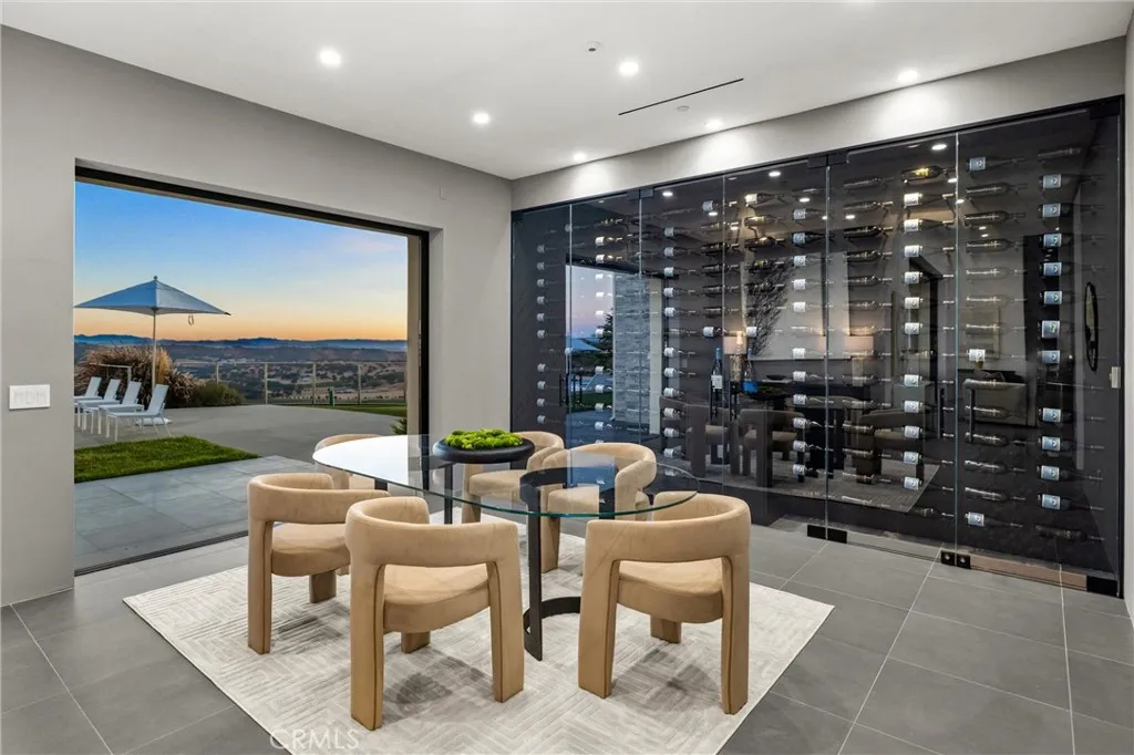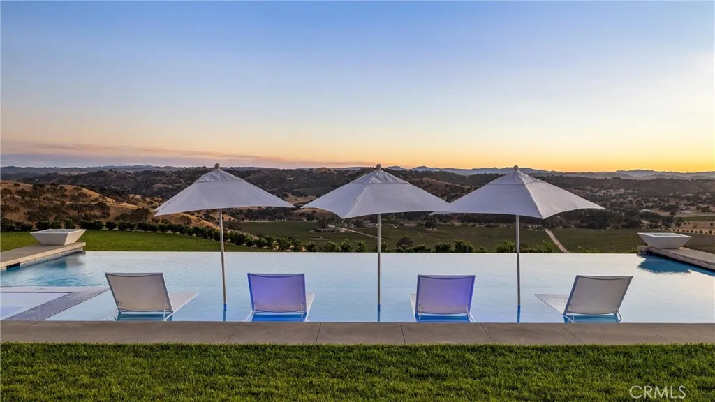 Escape to the majestic rolling hills of Paso Robles, a premier destination in California’s wine country. Nestled on 40 private acres above the famed Cass Winery, this Modern Luxury Estate epitomizes the essence of indoor-outdoor living with sophistication and elegance. The Italian cypress-lined drive leads to the heart of the property, where the beautiful landscape invites you to experience the seamless integration of nature and modern architecture. The Grand Atrium serves as the estate’s main entrance and central hub, welcoming you into a space that effortlessly connects to both the main living areas and a private guest apartment. As you enter the wide-open living room you experience panoramic views of rolling hills through expansive sliding glass doors that seamlessly transition between the interior space and the outdoors, blurring the line between the two environments. The gourmet kitchen is a chef’s delight, featuring a stunning waterfall island with moonstone quartz countertop w/ top tier appliances, and a Vinotemp Private Reserve wine refrigerator adds a touch of artistry. The kitchen nook has direct access to the outdoor alfresco kitchen. And a formal dining room provides an elegant setting, complete with a 300+bottle temp-controlled wine wall. The primary en-suite offers a private sanctuary, with breathtaking views. A Brazilian white Calcite stone fireplace adds warmth, while the en-suite bathroom offers a spa-like retreat. Dual custom vanities, a freestanding tub, a luxurious waterfall rain shower designed by Franco Sargiani are surrounded by Verde Fusion stone from Brazil. The suite boasts dual closets, custom cabinetry & lighted shelving. Additional guest accommodations include two en-suite bedrooms, a fully equipped gym for wellness enthusiasts and a private studio with open-concept living. Outfitted w/ luxurious finishes, two private decks, a full kitchen, laundry closet, and a stunning walk-in shower. The Outdoor living space offers a resort-caliber setting with a state-of-the-art alfresco kitchen. The infinity-edge pool overlooks Paso Robles’ rolling hills, offering a backdrop for relaxation. A heated built-in hot tub, Baja sun shelf, and in-pool seating enhance the experience, while a resort-style putting course, designed by renowned Camron Howell, adds a playful touch. The outdoor amenities also include bocce ball court and built-in basketball hoop, ensuring that every aspect of the estate is as luxurious as it is functional.