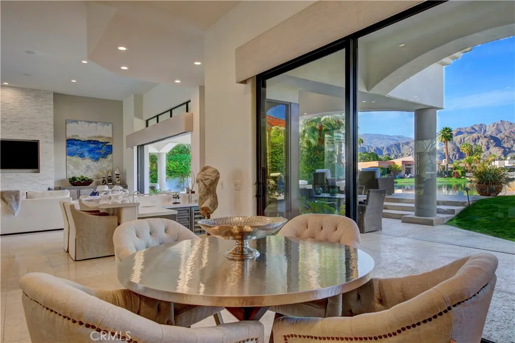 The large, private pool features a raised hot tub and sleek infinity edge overlooking the serene lake. There are plenty of lounge chairs and sofa seating to enjoy the view or share a glass of wine. After another amazing day in the California Desert, grill up some steaks at the built-in BBQ island and enjoy your meal al fresco at the outdoor dining table that seamlessly opens to the main living area of the home.