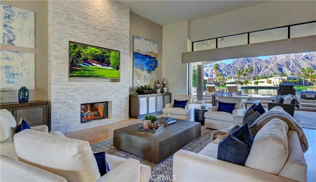 This remarkable estate welcomes guests through a private gated courtyard with a tranquil water feature leading to the custom 9ft glass entry doors. Walk into the open concept great room featuring a modern stacked stone fireplace with a large HDTV, fireplace and awe-inspiring mountain views that are highlighted by the indoor/outdoor living space created by the disappearing glass wall. Enjoy cocktails and conversations at the fully-equipped wet bar with a wine fridge and barstools just off the living room.