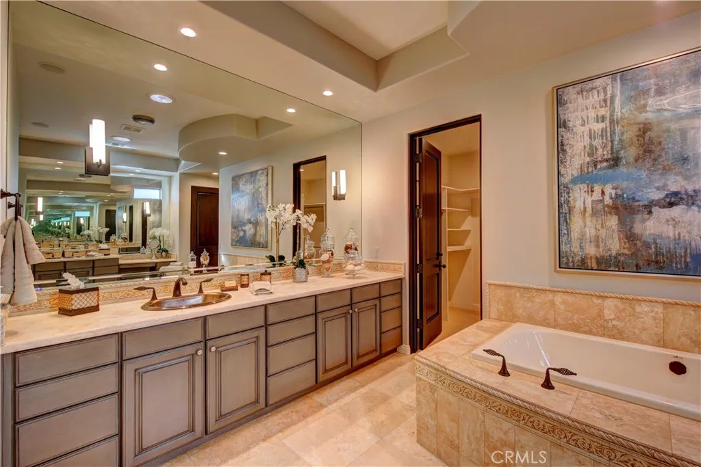The fully-equipped chef’s kitchen features stainless-steel appliances, double oven and an oversized center island. There are ample seating options as well between the wrap-around breakfast bar, casual kitchen table and formal dining area with an elegant chandelier seats eight guests.