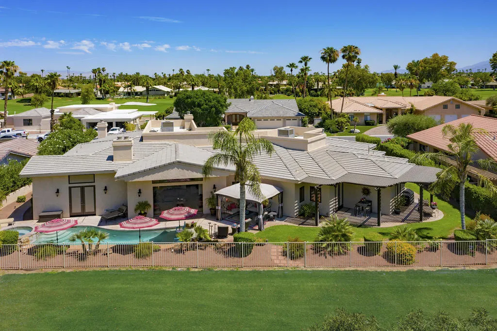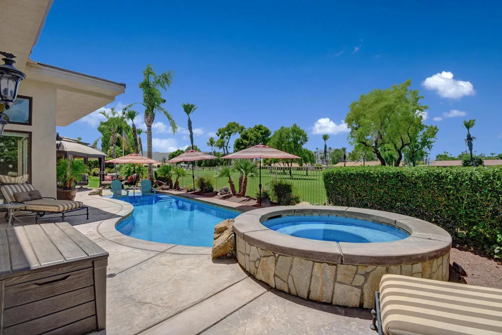 Come enjoy this custom built home located in Bermuda Dunes Country Club, offering over 4,000 sq. ft. of living space with 4 bedrooms, 4.5 bathrooms, and a view that can’t be beat! Upon entering you are greeted by a beautiful water feature and a family room fit for family lounging or entertaining on any scale. The living room hosts large glass pocket doors that can be folded back to create a gorgeous indoor/outdoor area. Perfect for conversation and a cocktail with friends and family while you enjoy a sunset view of the pool and golf course. If you prefer the outdoors, this home offers stylish and comfortable garden furniture with a fire-table for those chilly nights. There is a private pool and spa with a tanning shelf for your enjoyment, and a BBQ for outdoor cooking and dining. Back in the home there is a large flat screen television in the family room with a beautiful stacked stone fireplace and easy access to the fully stocked kitchen. The kitchen is nicely upgraded with granite counter tops, stainless steel appliances, and a long counter perfect for any chef who needs prep space. The master bedroom features a king bed with a large luxurious bathroom and walk in closet. The second and third bedrooms each offer king beds and their own private bathrooms. The fourth suite offers a queen bed with private bathroom. Book now for a spectacular home in a community nationally recognized for its rich history and star studded guest list.