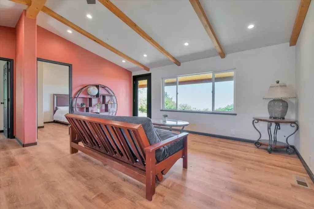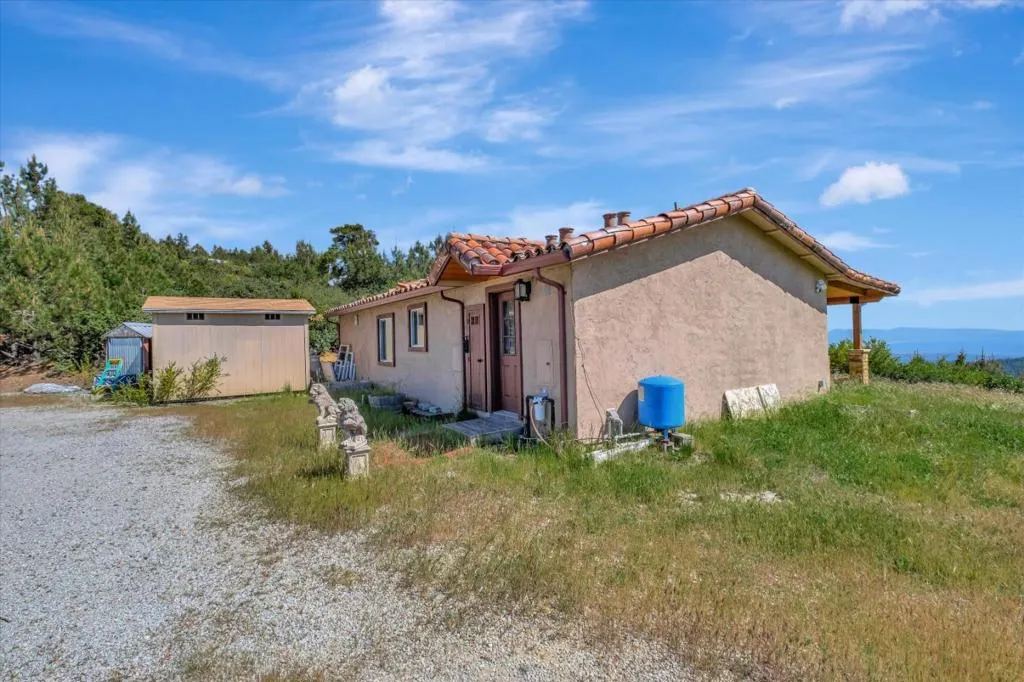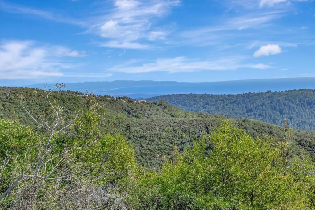 Spectacular end-of-road setting at the top of the world! At the culmination of your drive over paved and unpaved roads you pass through the front gate and onto the grounds of this broad skyline estate that overlooks the trailhead of nearby Demonstration Forest in the foreground, out to the expanse of the entire Monterey Bay. The upper section of its over 19 acres of gently sloped ridge is bedecked with now-dormant trellised rows that could be transformed into a vineyard, followed by a series of greenhouse sites and a large level pad that can accommodate a tennis or basketball court. Multiple storage buildings and refrigeration units lend to re-opening as a thriving agrarian compound, or to repurpose as a full-scale winery. With an available yurt and RV for guests, the home presides over these surroundings with Mediterranean flair under soaring ceilings, bedecked in hardwood and granite, offering comfortable single level living with a broad veranda well-suited for the sunny climate.