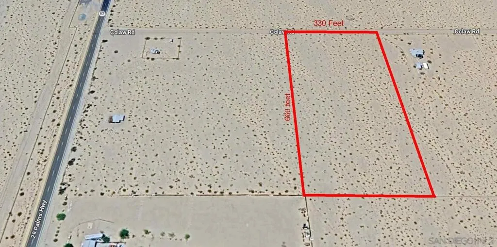 Seller financing available: 20% down, 8% interest, 5 years, interest only. 5 acres of flat usable land. Telephone poles in the street. Homes on neighboring lots. Quiet and peaceful community. 660 feet from the main highway. Close to town and walking distance to 29 palms airport.