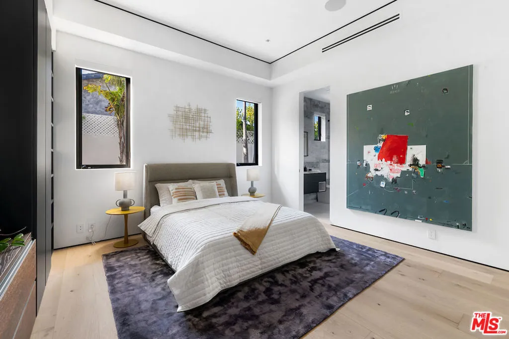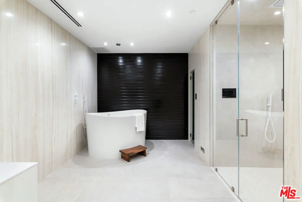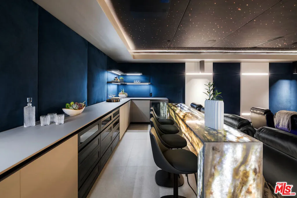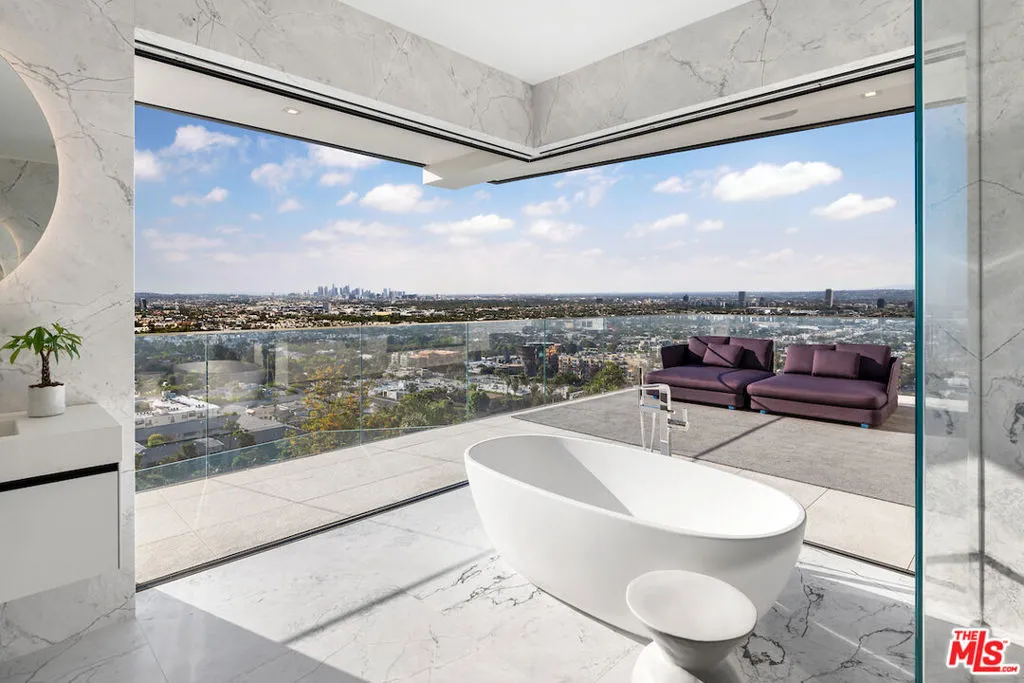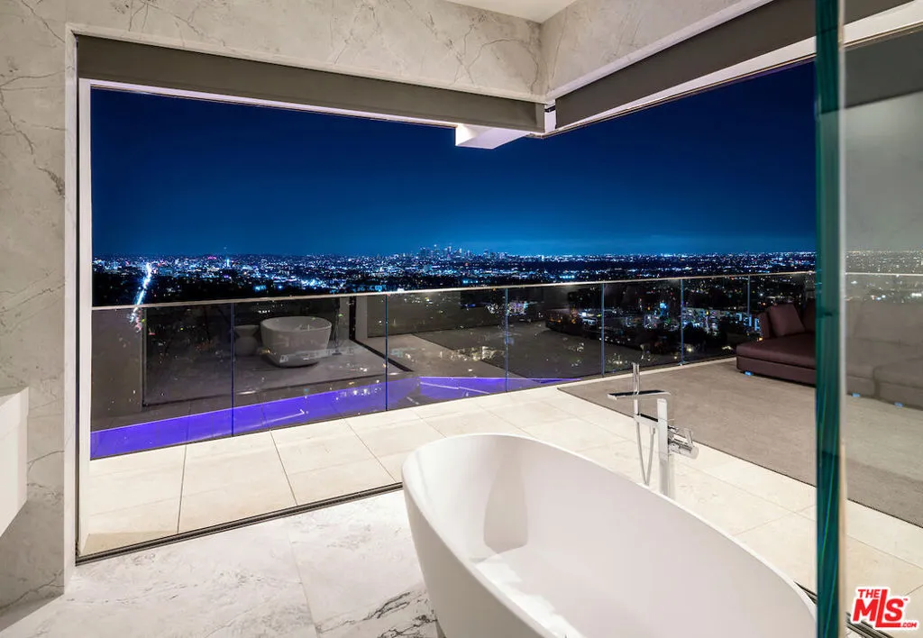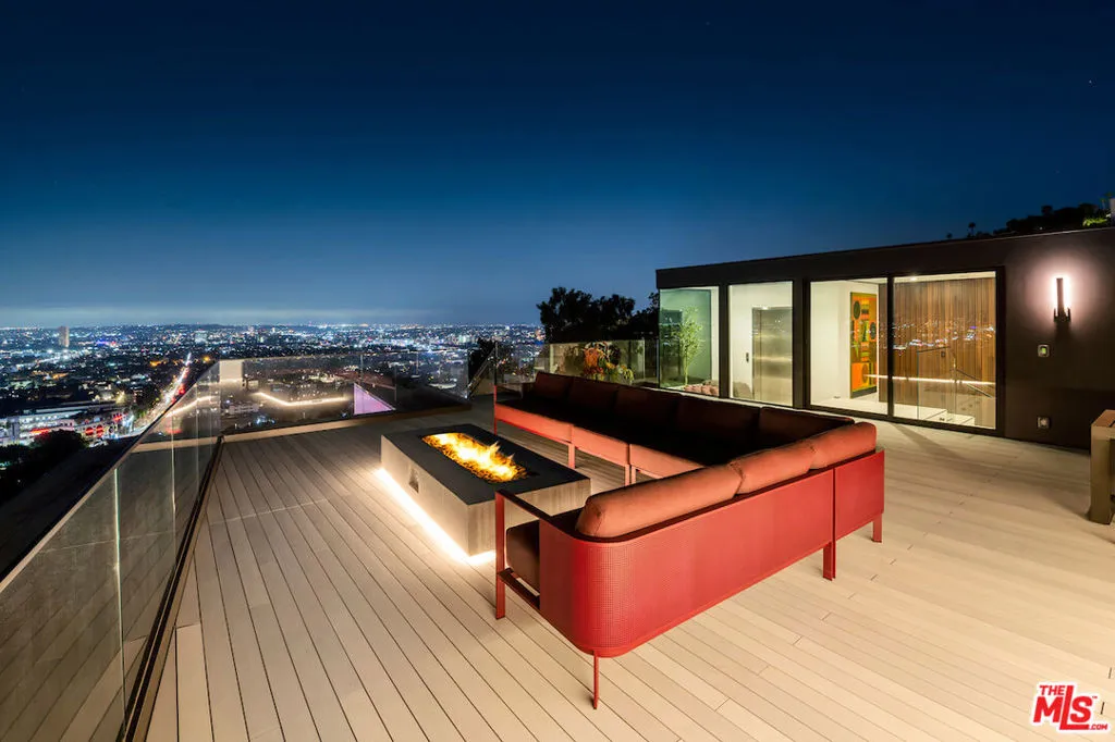 Situated in a prime lower hillside location above the renowned Chateau Marmont, this newly constructed residence offers the epitome of luxury Los Angeles living. Past a double gated motor court, the home’s modern steel, stone, and glass facade opens to a truly luxurious interior created by award-winning Nathalie M Designs that is filled with disappearing walls of glass, architectural clean lines, European Oak Wire Brushed floors, 6,399 square feet of deck space, and thoughtful high-end finishes. A functional open layout includes the main living area, grounded by an impressive stone fireplace, and grand dining area, both intended to take in the uninterrupted skyline views. A contemporary dual island kitchen with a secondary dining area sits open to both the main living and dining areas, outfitted with custom two-tone cabinetry, beautiful shadowy stone waterfall surfaces, and seamless top-grade appliances. A designer butler’s pantry, guest powder room, secondary ensuite bedroom, and car gallery round out the main level. Sliding glass walls pocket seamlessly from the main living area for uninterrupted access to the outdoor deck and picturesque zero-edge pool with spa, designed with intricate tiles and a relaxing shallow sundeck. Glass railings allow for every opportunity to take in the views, while a covered lounge area and bar-edged outdoor kitchen provide ample entertainment areas. The upper level of the home includes the dazzling primary suite, crafted with a stunning stone-facade fireplace, purposeful wet bar, substantial custom closet, a stone-wrapped spa grade bathroom, and of course, glass pocket walls to access the private patio and take in the incredible views. A plush lounge area, outdoor patio, and three secondary bedrooms all featuring ensuite designer bathrooms and some including private outdoor spaces, complete the top floor of the residence. Accessed via floating staircase from the second level outdoor patio, or interior elevator which is accessible to all floors and rooftop, the pinnacle of the property features an expansive rooftop deck, outfitted with a full outdoor kitchen, gas firepit, and glass railings for an epic vantage point. At the lower level of the home, a secondary living area contrasts sleek white walls with a magnificent book matched stone fireplace and entertainment area, ultimately leading to two additional secondary bedrooms with designer ensuite bathrooms, a plush galaxy-ceiling theater, designated laundry room, and resort-level spa, complete with oversized soaking tub, glass enclosed shower, and stone steam room. Additional aspects of the home include a second garage, intricate lighting to accent key architectural features, a state-of-the-art surround sound system, top of the line smart home technology, and an impressive fully equipped home security system.
