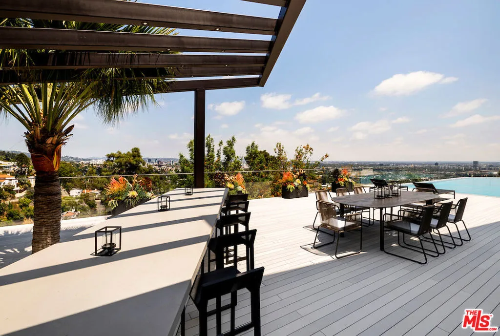 Situated in a prime lower hillside location above the renowned Chateau Marmont, this newly constructed residence offers the epitome of luxury Los Angeles living. Past a double gated motor court, the home’s modern steel, stone, and glass facade opens to a truly luxurious interior created by award-winning Nathalie M Designs that is filled with disappearing walls of glass, architectural clean lines, European Oak Wire Brushed floors, 6,399 square feet of deck space, and thoughtful high-end finishes. A functional open layout includes the main living area, grounded by an impressive stone fireplace, and grand dining area, both intended to take in the uninterrupted skyline views. A contemporary dual island kitchen with a secondary dining area sits open to both the main living and dining areas, outfitted with custom two-tone cabinetry, beautiful shadowy stone waterfall surfaces, and seamless top-grade appliances. A designer butler’s pantry, guest powder room, secondary ensuite bedroom, and car gallery round out the main level. Sliding glass walls pocket seamlessly from the main living area for uninterrupted access to the outdoor deck and picturesque zero-edge pool with spa, designed with intricate tiles and a relaxing shallow sundeck. Glass railings allow for every opportunity to take in the views, while a covered lounge area and bar-edged outdoor kitchen provide ample entertainment areas. The upper level of the home includes the dazzling primary suite, crafted with a stunning stone-facade fireplace, purposeful wet bar, substantial custom closet, a stone-wrapped spa grade bathroom, and of course, glass pocket walls to access the private patio and take in the incredible views. A plush lounge area, outdoor patio, and three secondary bedrooms all featuring ensuite designer bathrooms and some including private outdoor spaces, complete the top floor of the residence. Accessed via floating staircase from the second level outdoor patio, or interior elevator which is accessible to all floors and rooftop, the pinnacle of the property features an expansive rooftop deck, outfitted with a full outdoor kitchen, gas firepit, and glass railings for an epic vantage point. At the lower level of the home, a secondary living area contrasts sleek white walls with a magnificent book matched stone fireplace and entertainment area, ultimately leading to two additional secondary bedrooms with designer ensuite bathrooms, a plush galaxy-ceiling theater, designated laundry room, and resort-level spa, complete with oversized soaking tub, glass enclosed shower, and stone steam room. Additional aspects of the home include a second garage, intricate lighting to accent key architectural features, a state-of-the-art surround sound system, top of the line smart home technology, and an impressive fully equipped home security system.