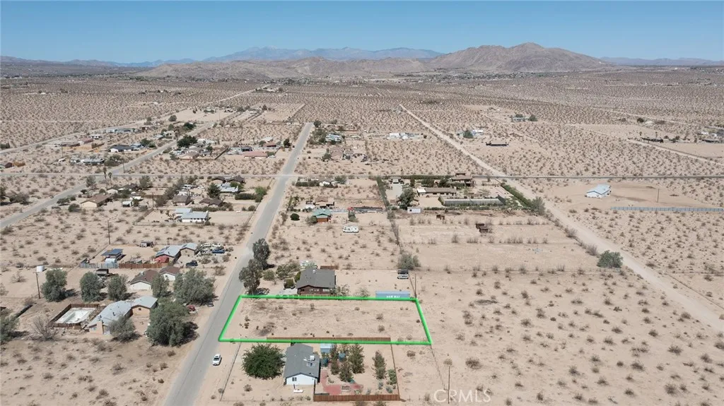 Buildable lot on paved road in up & coming Joshua Tree neighborhood. Utilities, water & electric appear to be in the street (buyer to check). Green lines demarcating boundaries are approximate; street address is not official – do not use to GPS to property. Locate with APN: 0605-091-05