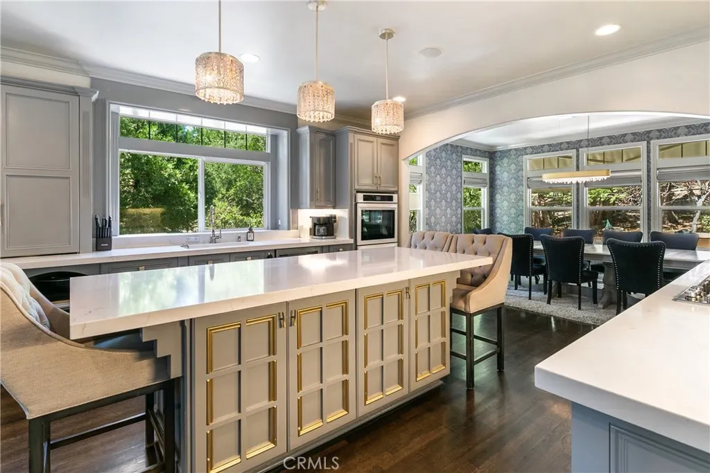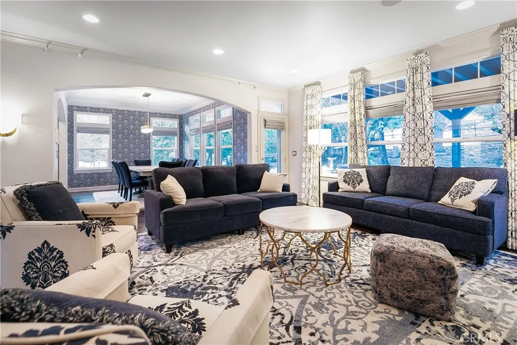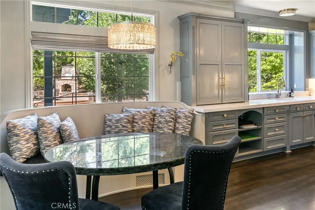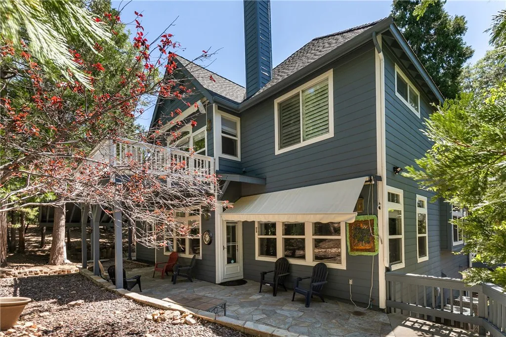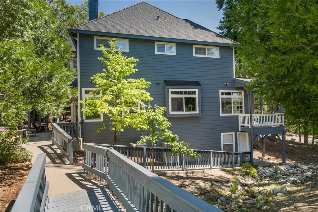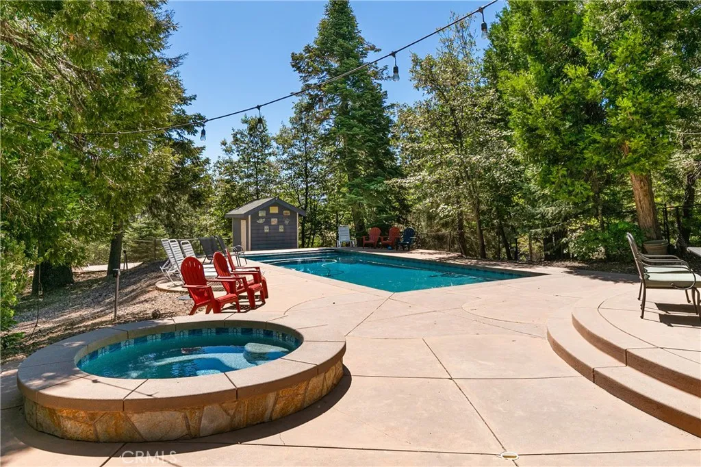 Designer Home in Arrowhead Woods with Outdoor Pool & Spa! Yes this home has lake rights! This gorgeous home is located in the Summit area of Lake Arrowhead on 1/2 acre of land. Seller also owns additional 1/2 acre adjacent to property & is available for extra money. One of the few areas of Lake Arrowhead with underground utilities. This home has only had two owners. Whole house remodel in 2017. Level entry home with long driveway & plenty of street parking for hosting a party or bbq. Foyer has two story ceiling with sparkling chandelier & one of a kind wrought iron railing wrapped around staircase. Tiger-sawn hardwood floors with an ebony finish carries throughout living areas on main level. There are two spacious living areas with large windows over looking expanding forest & cozy fireplace. Either area can flip flop as living room or dining room depending on buyers taste. Impeccable kitchen that would impress any gourmet chef. Kitchen has designer blue painted cabinets with quartz countertops & one of a kind backsplash mural behind stove. Oversized island that can also serve as a table for casual dining. The bar area & built in breakfast booth is the perfect spot to enjoy coffee or a cocktail. Bar countertop and booth Table-Top is made from rare Brazilian “Aphrodite” Granite, both cut from the same slab. The outdoor space feels like a luxury resort. Deck overlooks spacious land with no neighbor insight. Custom stone outdoor fireplace with large seating area nearby outdoor pool & spa. Pool was built in 2009, completely re-plastered and re-tiled 5/2021 with “Pebble Tech” Finish, decorated with iridescent abalone shell and blue/green elements, beautiful! Electrically operated retractable pool cover, keeps water temperature 82-85 degrees in the summer with only sunlight to heat it. The programmable pool/spa heater is capable of keeping the pool at any temperature you like, all year-round. Bedroom with en suite located on main level along with laundry room & 3 car garage. Upstairs has a huge family room that previously had enough space for a pool table. Perfect spot for movie night. Primary bedroom suite with vestibule entry, seating area with fireplace, gigantic windows overlooking lush forest, huge walk in closet & chic bathroom with designer finishes. The three additional bedrooms on this floor are large & can fit any size bed. The build up has a large 15’x19’ section with an 8 foot ceiling. Smart features, 6 zone heating & AC!