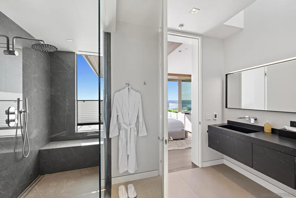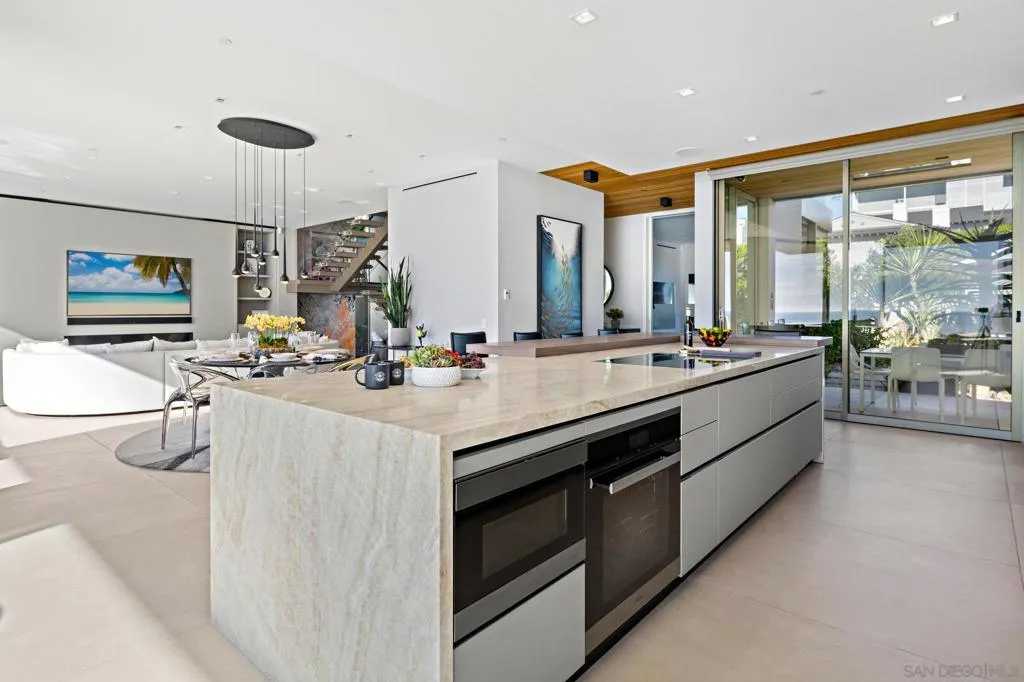 Rental rates are WEEKLY. Jewel is a 2021 luxury contemporary ocean front residence like no other. Located in La Jolla perched over the world famous Windansea Beach, enjoy unobstructed white sand and whitewater views from several rooms within the home. Spanning 4,000 sq ft, this elegant 4 BR/ 6 BA home blends elegance with a unique vacation experience. The design includes 10′ high glass walls, an ocean-facing pool, rooftop lounge, and designer furnishings. The state-of-the-art European inspired design yield an open floor-plan living area is filled with natural light, featuring a custom sectional, linear gas fireplace, 75” flat-screen TV with surround sound, and a sleek kitchen with Miele appliances. The adjacent Ocean Lounge boasts 180-degree views, perfect for admiring the surf and marine life. Outside, the view lounge overlooks the swimming pool, fire features and ceiling heaters provide cozy warmth for evening entertaining. A beach-level cabana bathroom, complete with towel warmers and showers, provides a convenient spot to rinse off after a swim or beach day. 2nd level features four bedrooms, each with en-suite bathrooms and custom cabinetry. The Primary Suite offers stunning ocean views, a luxurious bathroom, and a private terrace with seating. The Ocean Suite, Garden Suite, and Family Suite each provide comfort and beautiful views. The Sky Lounge rooftop offers 360-degree views and a fully stocked kitchen with a Lynx grill and fire table. An in-home gym and other amenities to enhance the experience. Call to make this oceanfront dream your reality this season!