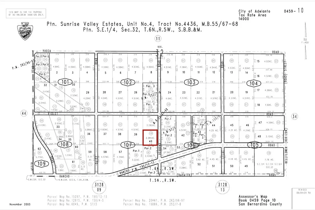 Adelanto Industrial Land Offering. ±2.28 acres of vacant land zoned MI. Fronting along the west side of Verbena Rd just 280 linear feet north of Rancho Rd and immediately adjacent to the north of The San Bernardino County Human Services office building where water and electricity can be found. The Manufacturing/Industrial (MI) district provides for a wide range of industrial uses, including light and heavy industrial and manufacturing uses. Adult businesses as well as certain cannabis related businesses are also conditionally permitted within this zoning district. Well positioned in the Adelanto Industrial Park region 1.4 miles west of Hwy 395. Perfect opportunity to develop or invest for the future.