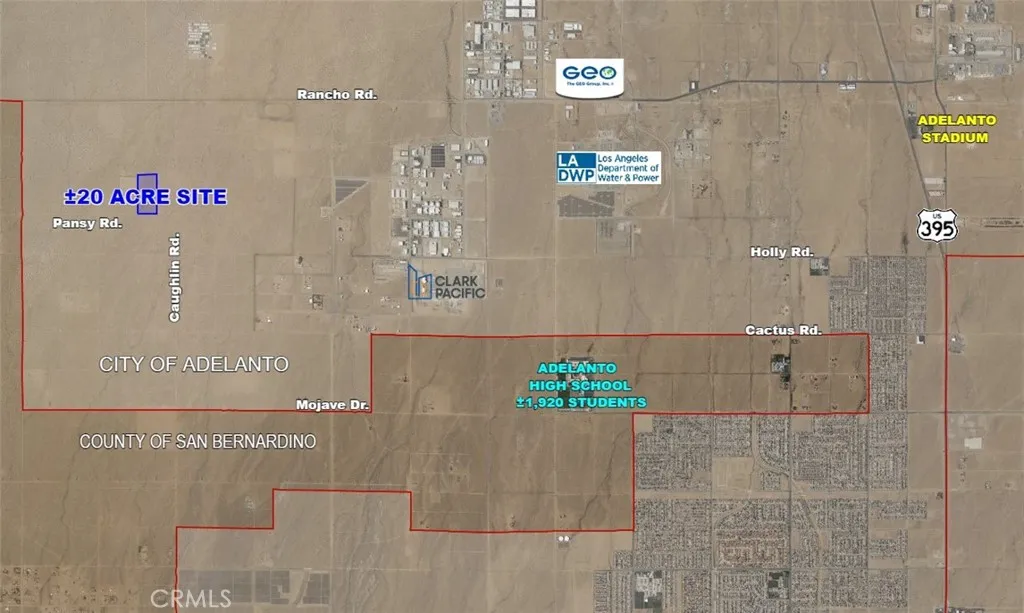 ±20-acre site on Pansy Rd., west of Caughlin Rd., in the City of Adelanto. Currently zoned Open Space (OS), this parcel may allow for a zone change as it sits just outside of the Light Manufacturing Cannabis Only zone. Buyer to verify all zoning information and availability of utilities with the applicable agencies.