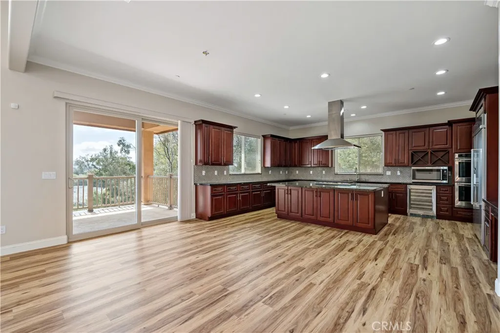 The open-concept great room boasts picturesque views and seamless access to a covered balcony, complete with a dual-sided fireplace for cozy evenings outdoors. The chef’s kitchen dazzles with granite countertops, a large island with a gas cooktop, stainless KitchenAid appliances, a built-in refrigerator, wine fridge, and double oven.