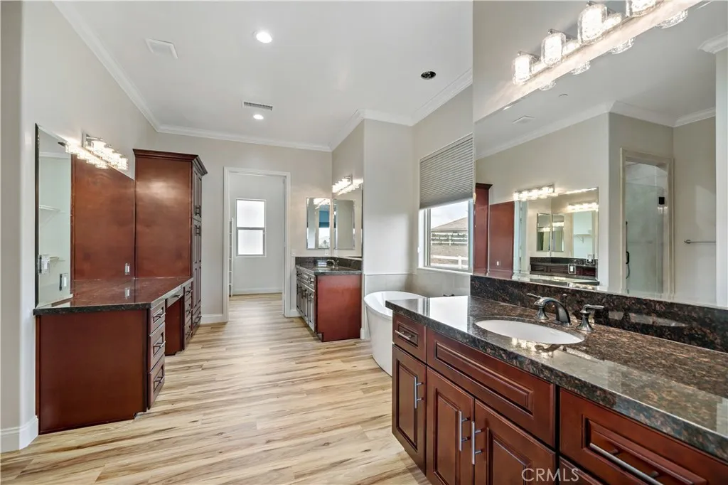 Nestled in the prestigious Meadowview community, this stunning custom-built 4-bedroom, 4.5-bathroom home offers luxurious living and unparalleled privacy just minutes from Temecula’s fine dining, shopping, and renowned wine country. Spanning 3,672 sqft on over half an acre, this thoughtfully designed residence features a main-floor master suite with an office or retreat, a mother-in-law suite with a private entrance, and oversized walk-in closets in every room. The master bedroom and the mother-in-law suite’s bathroom both feature luxurious custom showers, adding an extra touch of elegance.