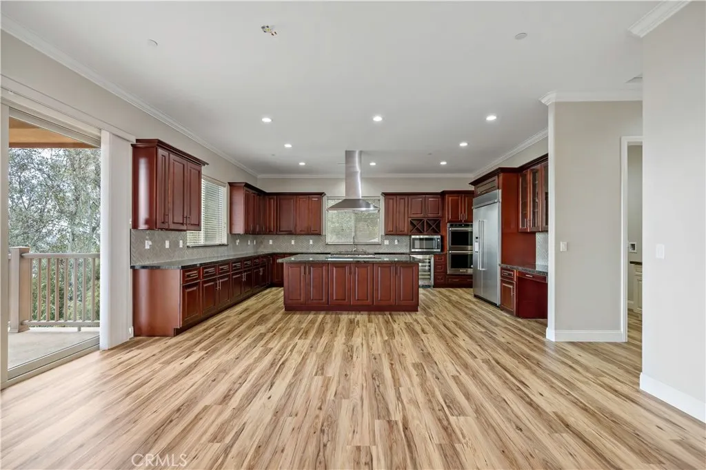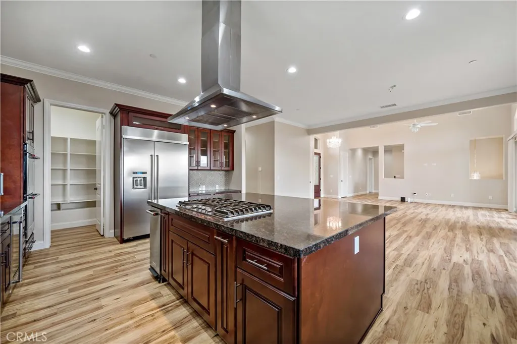 The open-concept great room boasts picturesque views and seamless access to a covered balcony, complete with a dual-sided fireplace for cozy evenings outdoors. The chef’s kitchen dazzles with granite countertops, a large island with a gas cooktop, stainless KitchenAid appliances, a built-in refrigerator, wine fridge, and double oven.