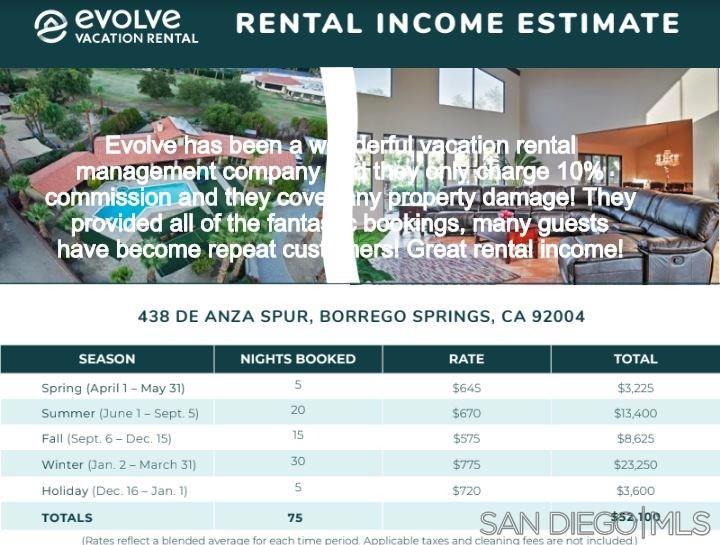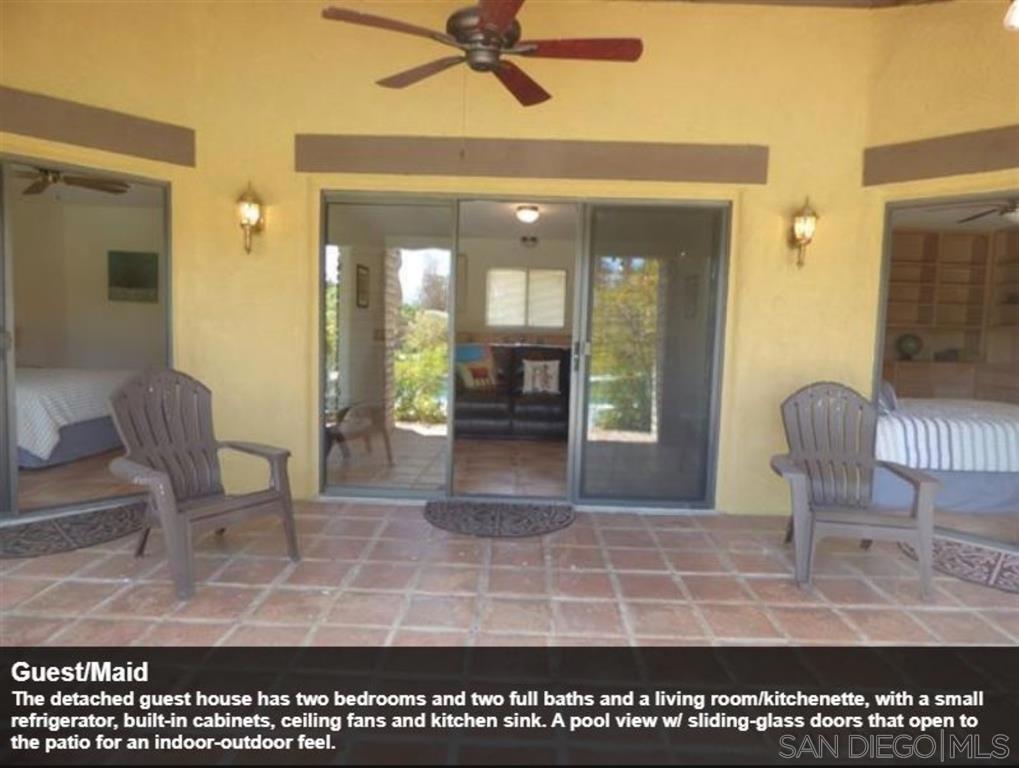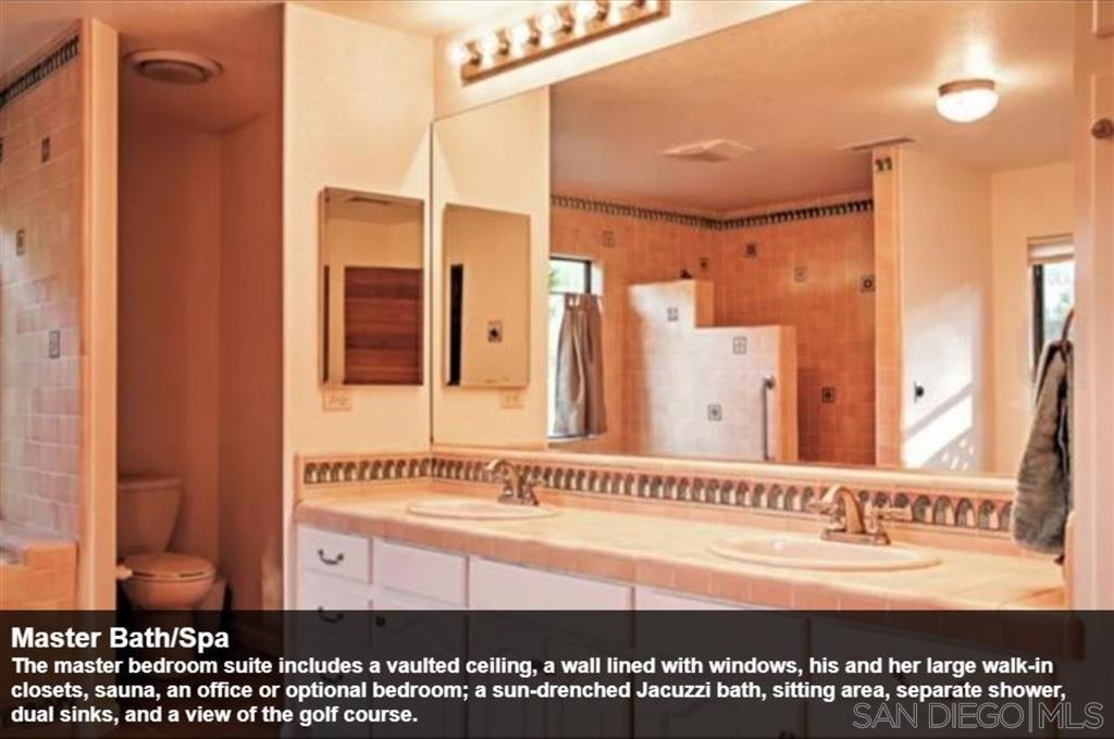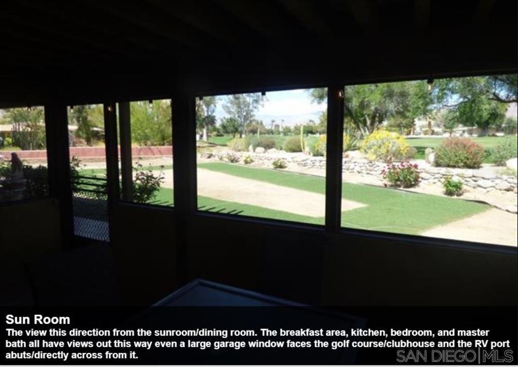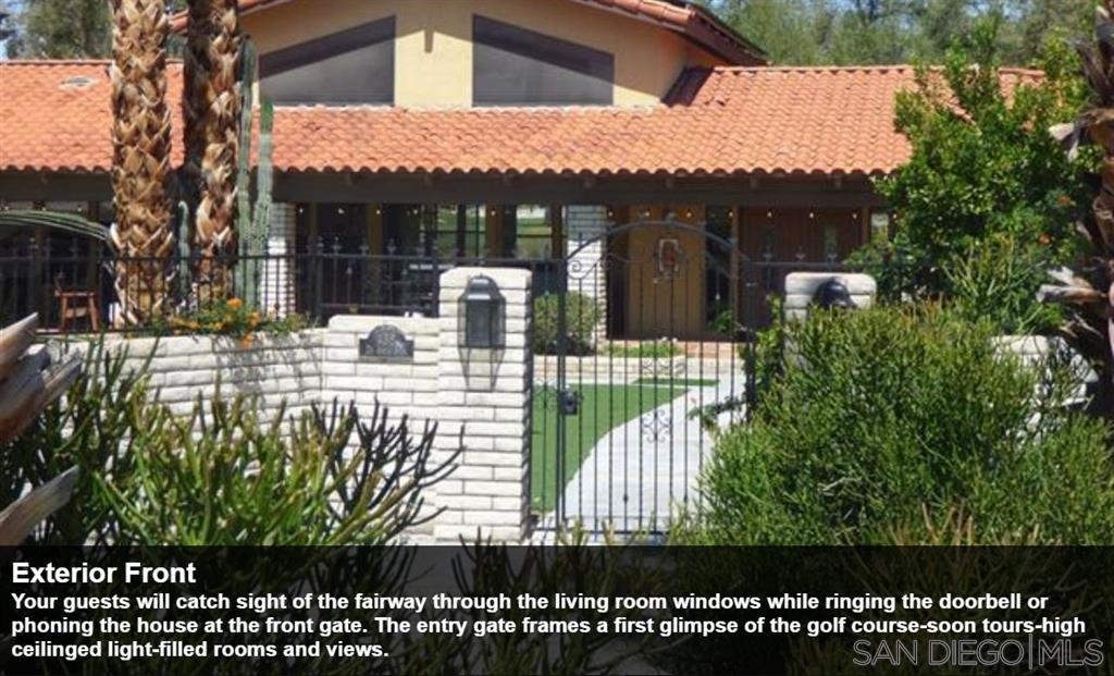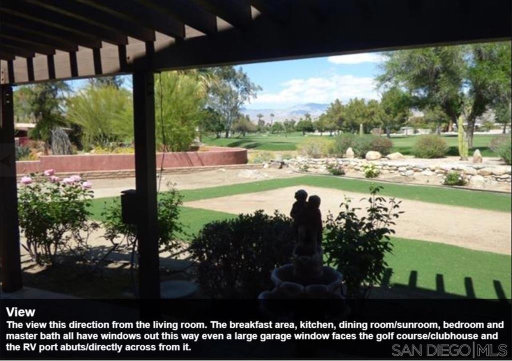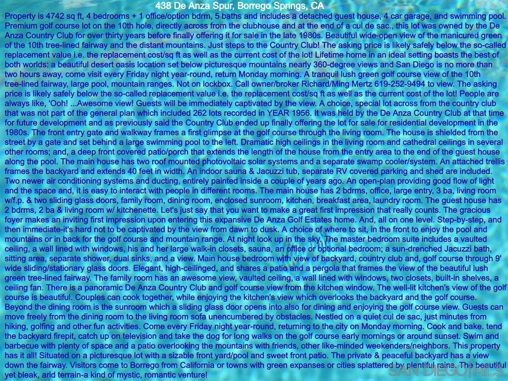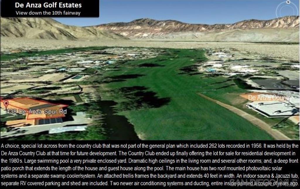 For many desert lovers and golfers, it doesn’t get much better than this wonderful 4742 sqft, 4 bdrm + 1 office/optional bdrm, 5 bath that includes a detached guest house, 4 car garage & huge swimming pool. Ultra-premium lot on the 10th hole directly across from the De Anza Country Club. The lot and setting are simply sensational-this extra special lot was held over 30 years for future club development before they finally agreed to sell it. Beautiful wide-open views of the manicured tree-lined 10th green & spectacular majestic mountain ranges! Serenity in nature! A choice, special lot across from the country club that was not part of the general plan which included 262 lots recorded in YR 1956. It was held by the De Anza Country Club at that time for future development. The Country Club ended up finally offering the lot for sale for residential development in the 1980s. Thank you in advance! The De Anza Country Club’s new owners have transformed it financially in terms of its balance sheet. The front entry gate and walkway frames a first glimpse at the golf course through the living room. The house is shielded from the street by a gate and set behind a large swimming pool to the left. Dramatic high ceilings in the living room and cathedral ceilings in several other rooms; and, a deep front covered patio/porch that extends the length of the house from the entry area to the end of the guest house along the pool. The main house has two roof mounted photovoltaic solar systems and a separate swamp cooler/system. An attached trellis frames the backyard and extends 40 feet in width. An indoor sauna & Jacuzzi tub, separate RV covered parking and shed are included. Two newer air conditioning systems and ducting, entire inside painted a couple of years ago. An open-plan providing good flow of light and the space and, it is easy to interact with people in different rooms. The main house has 2 bdrms, office, large entry, 3 ba, living room w/f.p. & two sliding glass doors, family room, dining room, enclosed sunroom, kitchen, breakfast area, laundry room. The guest house has 2 bdrms, 2 ba & living room w/ kitchenette. Let’s just say that you want to make a great first impression that really counts. The gracious foyer makes an inviting first impression upon entering this expansive De Anza Golf Estates home. And, all on one level. Step-by-step, and then immediate-it’s hard not to be captivated by the view from dawn to dusk. A choice of where to sit, in the front to enjoy the pool and mountains or in back for the golf course and mountain range. At night look up in the sky. The master bedroom suite includes a vaulted ceiling, a wall lined with windows, his and her large walk-in closets, sauna, an office or optional bedroom; a sun-drenched Jacuzzi bath, sitting area, separate shower, dual sinks, and a view. Main house bedroom with view of backyard, country club and, golf course through 9′ wide sliding/stationary glass doors. Elegant, high-ceilinged, and shares a patio and a pergola that frames the view of the beautiful lush green tree-lined fairway. The family room has an awesome view, vaulted ceiling, a wall lined with windows, two closets, built-in shelves, a ceiling fan. There is a panoramic De Anza Country Club and golf course view from the kitchen window. The well-lit kitchen’s view of the golf course is beautiful. Couples can cook together, while enjoying the kitchen’s view which overlooks the backyard and the golf course. Beyond the dining room is the sunroom which a sliding glass door opens into also for dining and enjoying the golf course view. Guests can move freely from the dining room to the living room sofa unencumbered by obstacles. Nestled on a quiet cul de sac, just minutes from hiking, golfing and other fun activities. Come every Friday night year-round, returning to the city on Monday morning. Cook and bake. tend the backyard firepit, catch up on television and take the dog for walks on the golf course early mornings…