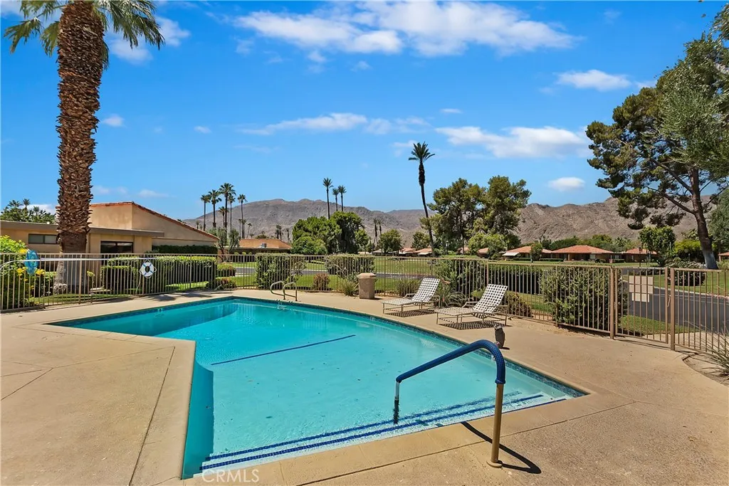 Available December 2025 and January 2026!! Welcome to Sunrise Country Club! This single level 1,700SF condo has 3 beds, 2 baths and perfect for a relaxing getaway. Play golf, tennis, pickle ball or swim in one of 21 pools. It has a beautiful pond and fountain view outside the living room sliding glass doors. One of many swimming pools with heated Jacuzzi is located a few feet from the front door. The master suite has a king size bed. The master bath has a wrap around countertop and a large walk in shower. One of the guest bedrooms has a queen bed. The third bedroom has 2 queen beds. The second bathroom is located in the hallway. The workable kitchen is equipped with all new appliances. The large living room has a 65′ Smart Flat Screen with DirecTV. There are many board games, books, 2 bikes with helmets/lock and pool toys. The location is ideal for a walk or bike ride to The River Shopping Center (1 mile away) for dining, shopping, and movie entertainment. The condo is only 4 miles from the world famous El Paseo Shopping District, known as the Rodeo Drive of the Desert! 28 day minimum stay required.
