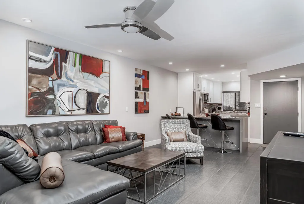 AVAILABLE November 1 to April 30, 2026. Centrally located in the gated community of DESERT VILLAGE in Rancho Mirage. Contemporary, modern bright quality condo. Upgraded furniture, kitchen cabinets, bathroom vanities, shower enclosures, appliances, hardware fixtures, tile floor throughout, window treatments, accessories, lighting, linens, towels, dishes, cutlery, cookware and outdoor courtyard patio. Main floor includes a Great Room Living area, Dining area, full Kitchen, main floor Guest Bedroom with Twin single beds, full Bathroom. Upstairs loft Primary Bedroom with King size bed, Private Bathroom Ensuite, Retreat and Outdoor Private Balcony. Community located within walking distance across the street to OMNI Resort Hotel/Restaurants, and THE RIVER Shopping, Theater, Restaurants and Entertainment Venues. In addition, discover Outdoor Activities; Hiking (Santa Rosa Mountains), Walking/Running/Cycling trails along adjoining Whitewater River Channel. Seasonal Vacation Rental Rates: January-April $3,900 per month, November-December $3,400 per month), May-October $2,600 per month.