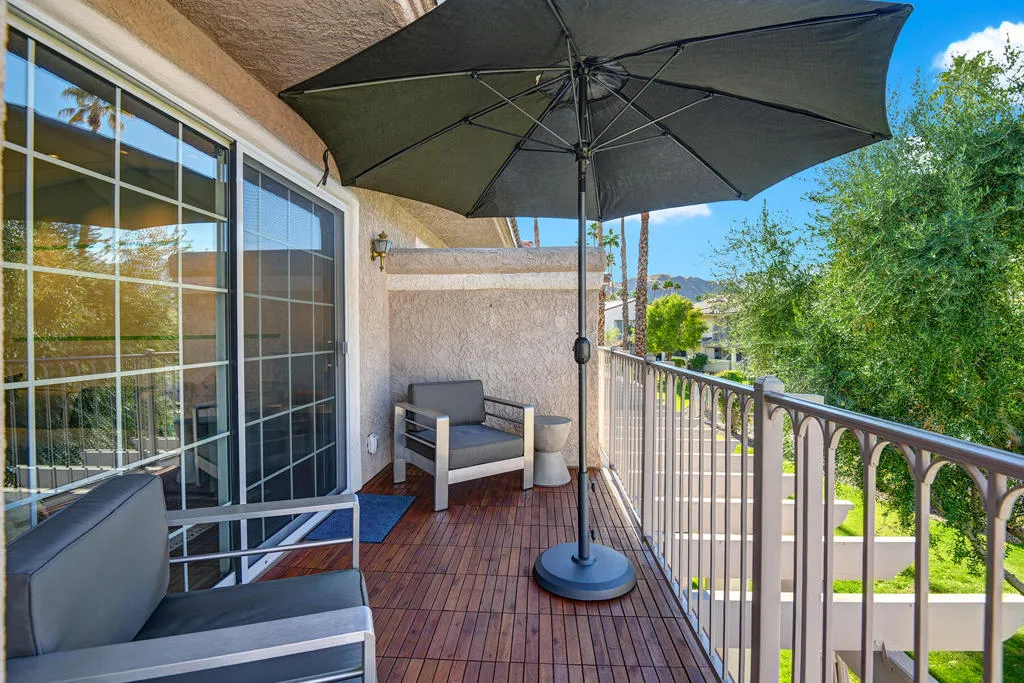 Welcome to your fully remodeled 2BR/2Bath oasis at Mesquite country club! This light, bright, upper level, move-in, ready gem offers spectacular mountain view, located in a serene, amenity-rich community. Exquisitely furnished and armoring fine arts immerse yourself in what Palm Springs lifestyle is all about. Enjoy the tranquility of a quiet neighborhood, paired with 2 tennis courts, 7 heated pools and 7 spas and more. Your ideal rental awaits. 10 minutes to downtown Palm Springs.Fully equipped kitchen, newer washer/dryer in laundry closet and appliances, smart TVs in the Master bedroom and living room, indoor and outdoor dining, higher ceilings, high speed internet and cable.