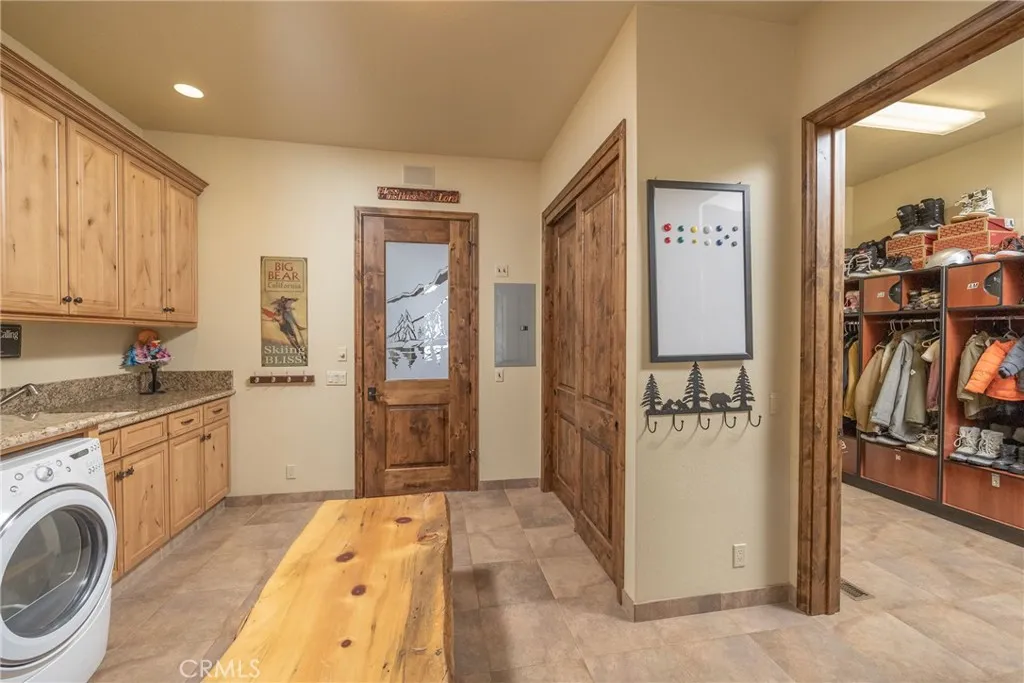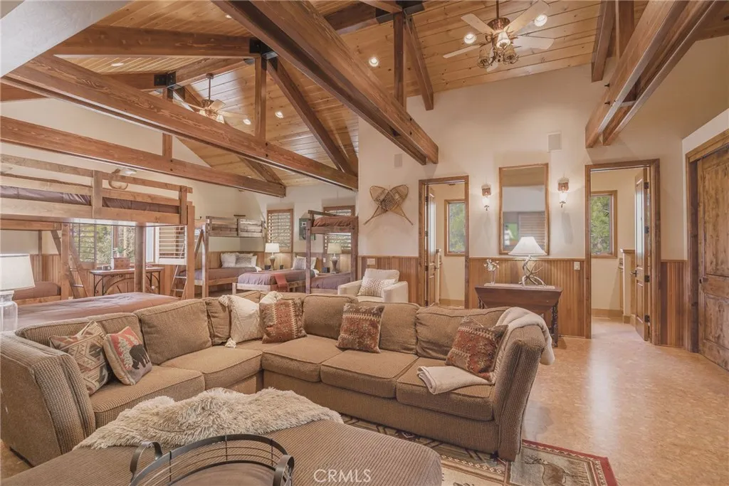 EXTRAORDINARY…STUNNING…SPECTACULAR are just words and pale in comparison to experiencing this homes magical setting, abundant features, beautiful architectural elements and the AMAZING LOCATION just 3 minutes away from Snow Summit’s winter & summer activities! As you enter you are instantly transported by the stunning wall of windows inviting the beauty of the outdoors…in! Peace and serenity are found in this homes many magical spaces AND SO IS the FUN! There is an amazing 10 bed bunk room that includes 2 ensuite bathrooms. There is a separate game room with pool table, TV, massive game closet, wood-burning fireplace and an expansive wet bar! The fun continues with frisbee golf, a horse shoe pit, putting and corn hole grass area, separate kids playhouse with rooftop deck and a built-4-kids Zipline! Boasting 2.74 acres that back to the national forest and an oversized 3 -car garage with adjacent storage room. Delivering outdoor living at its best with an outdoor spa, built-in BBQ, gas Lava fire pit and a massive concrete patio & composite deck perfect for dining and gathering. The exquisite kitchen has arguably the largest granite island you will ever see, providing fantastic space for food prep, casual dining & entertaining. This is a cooks kitchen with dual-fuel Wolf range, Subzero refrigerator and freezer, Viking warming oven, hot water pot filler and 2 Bosch dishwashers. The primary bedroom suite has a sitting area in front of a lovely fireplace, large closet and a luxury bathroom with jetted spa tub and huge steam shower. There is laundry on each level and the main floor laundry includes a fantastic locker room that is simply brilliant! Craftsmanship & quality are on display with hardwood plank flooring, custom wrought iron details, Anderson windows and sliding doors, custom lighting, central vacuum throughout, tankless water heaters, 4 forced-air heaters and CAT 9 wiring in the bedrooms. The Great Rm, Game Rm and Primary Suite have surround sound speakers and each bedroom has individual speakers to enjoy a personal listening experience. This property has a private well that provides water for the home and landscaping without a water Bill! This home provides so many options and would make a wonderful full-time home, special vacation retreat with good income producing potential, if desired.