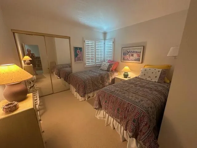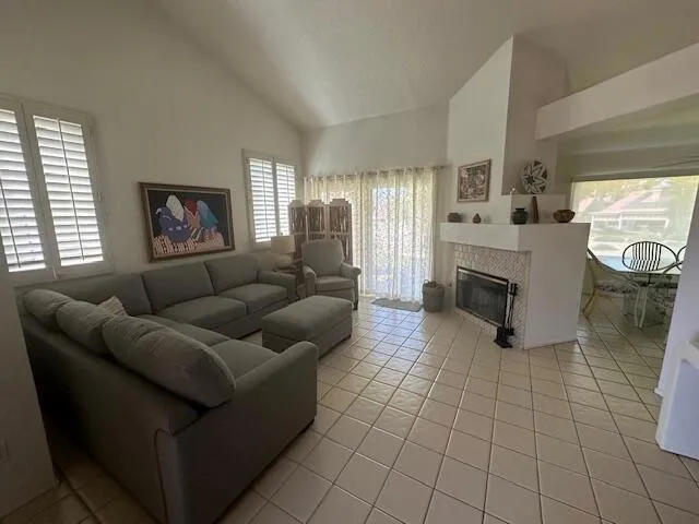 A great Champion Model, 2 bedroom, a den, a dining area, and 2 baths. 1360 square feet. Our largest model. With a private two car garage. Fabulous location elevated lot overlooking a pool and greenbelt area. Extremely well maintained. The living room offers high ceilings, a fireplace and access to one of the rear patios. A dining area with large picture window is off the light and bright fully equipped kitchen. All new windows and doors AC installed in 2021. Custom window treatments. The primary bedroom has a motorized roll down black out shade. The primary bathroom has a large soaking tub with a shower above. The guest bedroom has mirrored closet doors and the hallway bath has a shower stall. A stackable washer and dryer are in the hall. This unit is east facing for the glorious morning sun! Steps to the pool and spa. This unit is nicely furnished and is newly available for the 2026 season. Rented from January 1 through March 31st. Available in April Golf cart included. Located in the ever popular Palm Desert Resort Country Club, with clubhouse, bocce ball. 18 holes of golf and a very active pickleball and racquet center. 20 pools and spas.