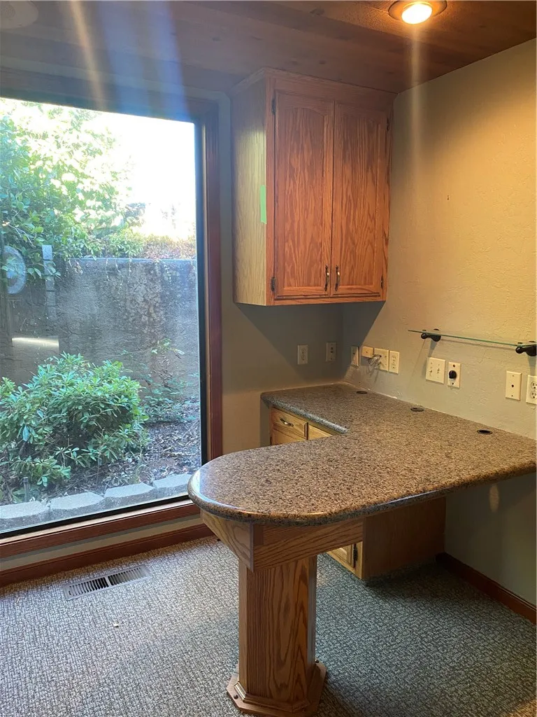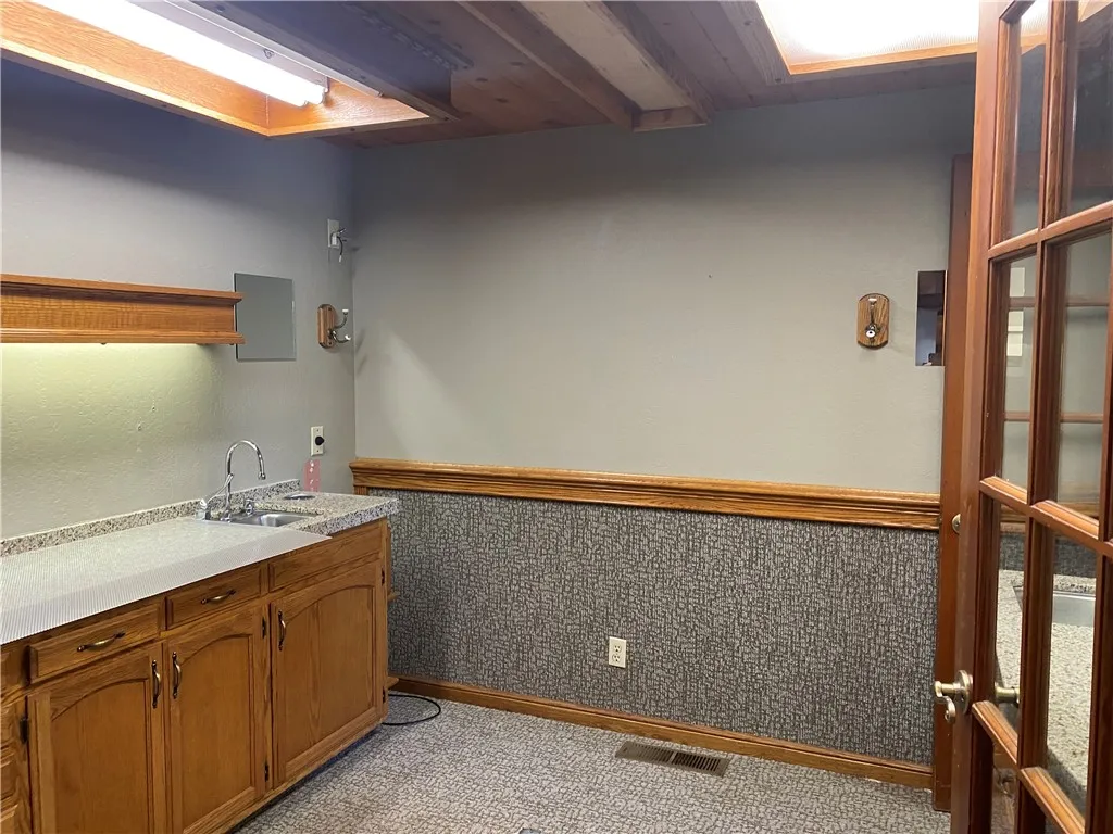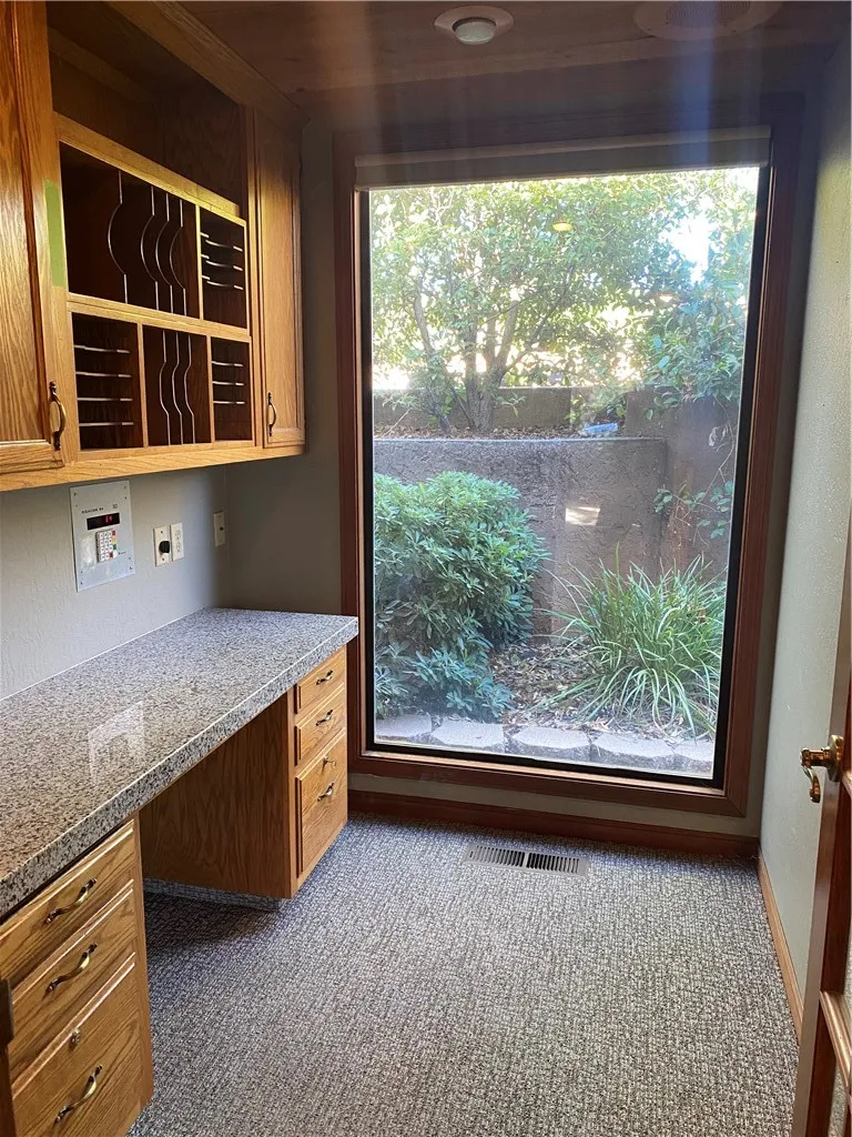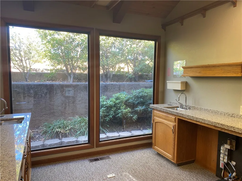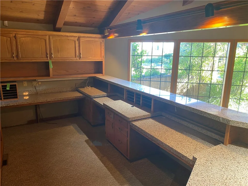 Currently configured as a dental practice, this versatile space could easily be adapted for a wide range of professional uses. The beautifully appointed interior features a spacious and welcoming waiting area with soaring vaulted ceilings, a prominent reception area, and multiple private offices and consultation rooms.