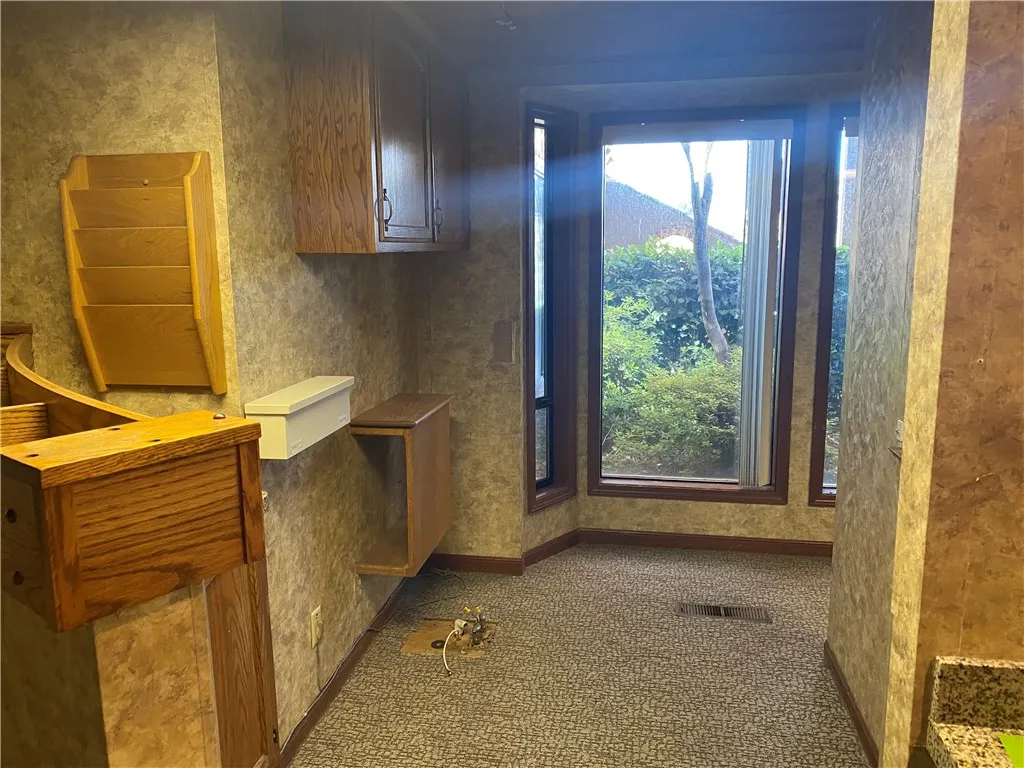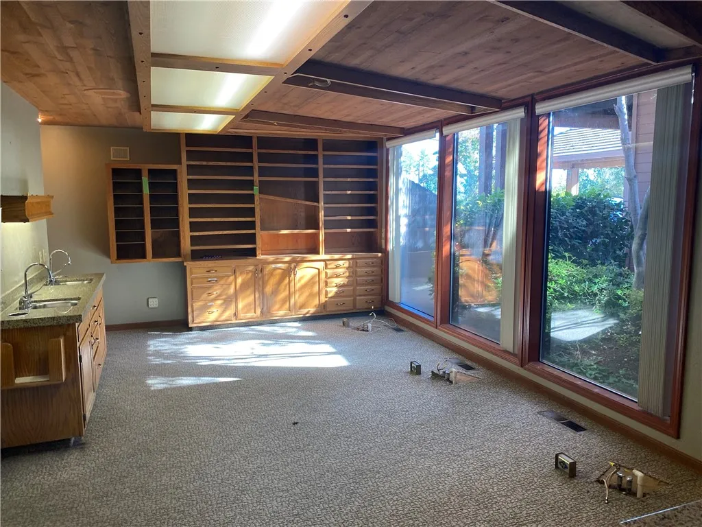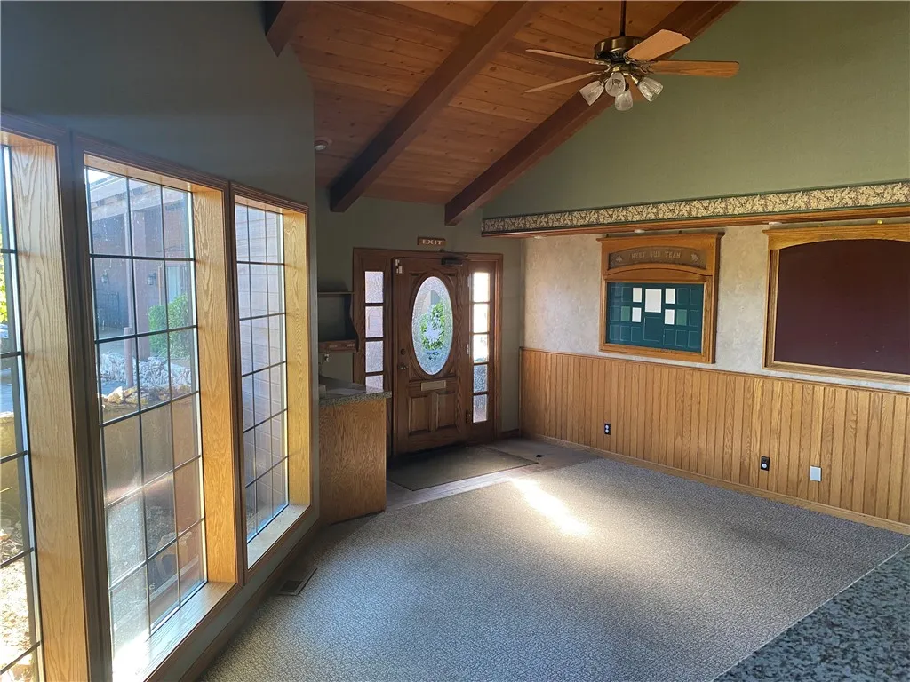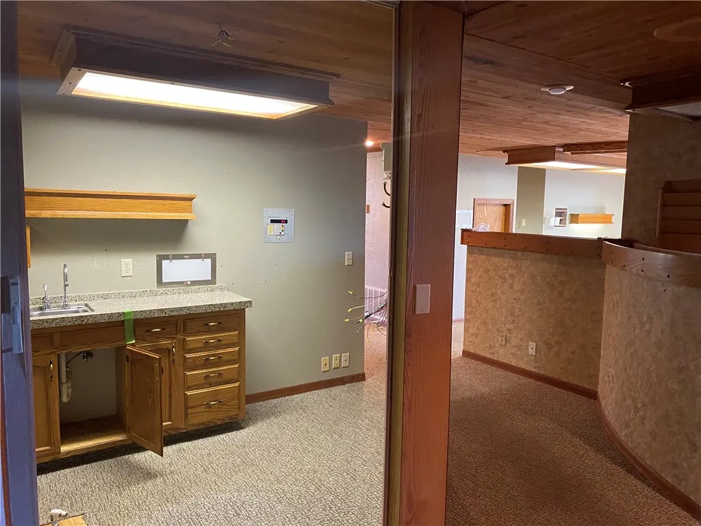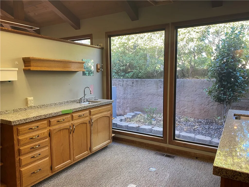 Currently configured as a dental practice, this versatile space could easily be adapted for a wide range of professional uses. The beautifully appointed interior features a spacious and welcoming waiting area with soaring vaulted ceilings, a prominent reception area, and multiple private offices and consultation rooms.