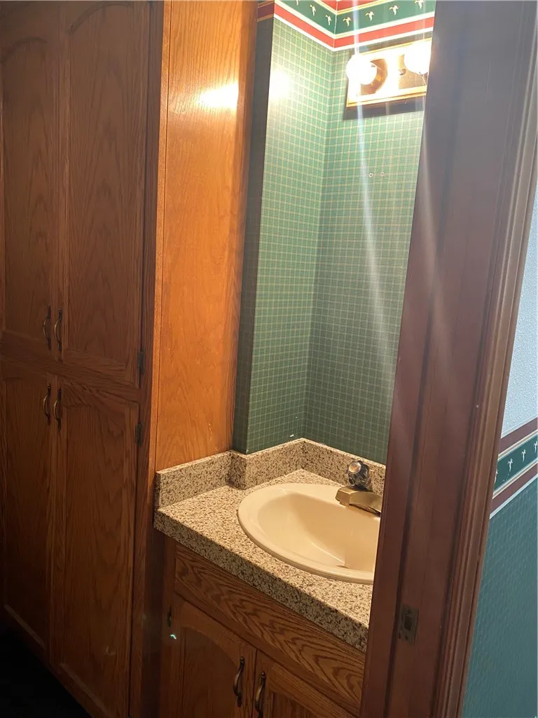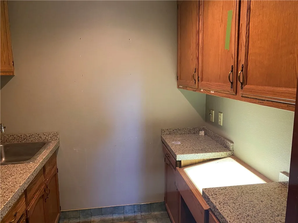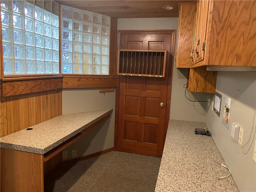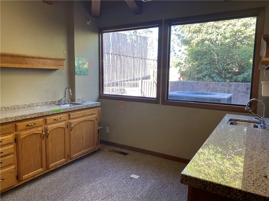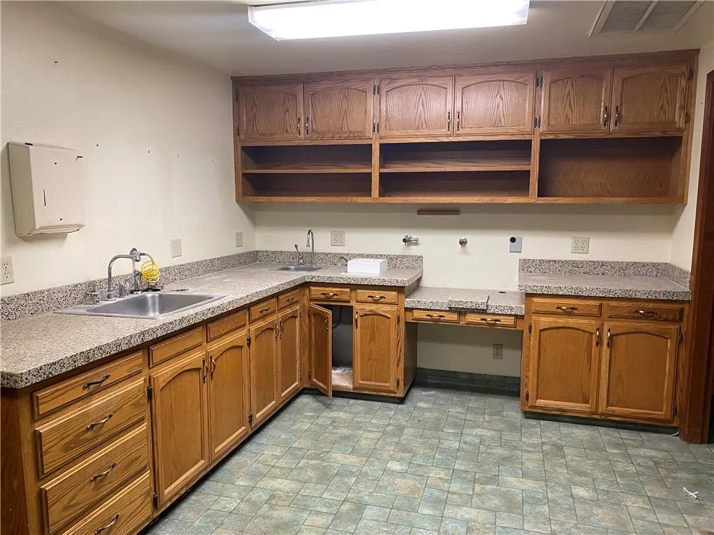 High-end finishes, including rich wood cabinetry and stone solid-surface counters, add warmth and professionalism throughout the suite.
