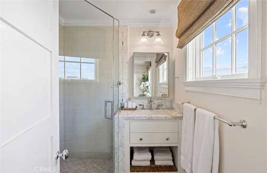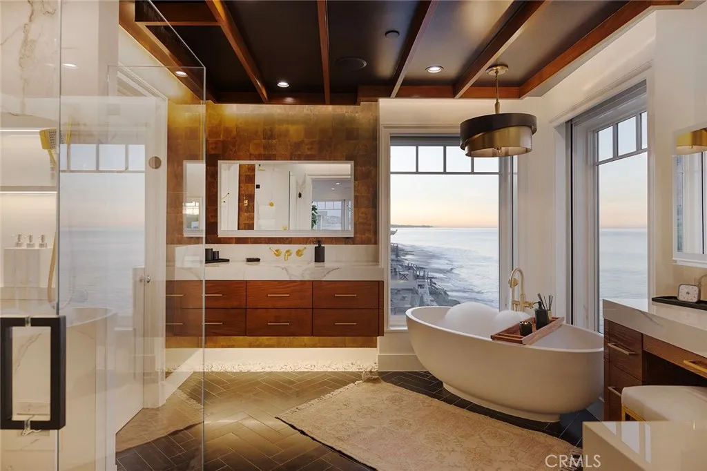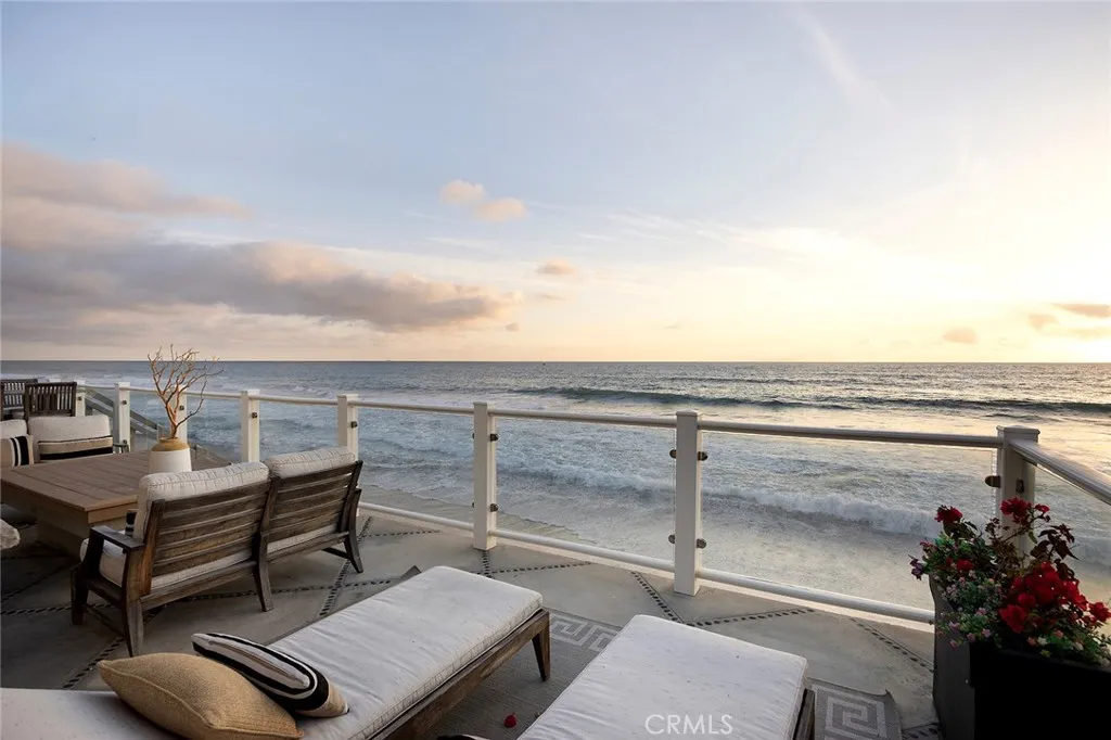 Immerse yourself in luxury at this exquisite oceanfront home, a true jewel in Orange County’s most coveted coastal neighborhood. Commanding a prestigious position on Beach Road, this home stretches across a 1.7-mile sandy expanse, nestled between the San Clemente Pier and Dana Point Harbor. Experience the epitome of Southern California’s “California Riviera,” a secure, private haven offering unparalleled views and serenity, 24-hour gated security included. A symphony of design, the home is a collaboration between renowned architects Bryant, Palmer, Soto, and interior designer Lane McCook. Its floor plan masterfully embraces the stunning ocean vistas, with the primary living areas overlooking the endless sea. The entrance ushers you into a lower level adorned with several sitting areas, soaring double-height ceilings, and a unique concrete-and-river-stone flooring blend. Crafted for the connoisseur, the home boasts three A/C zones and a private elevator accessing all levels. The oversized deck, complete with a fire pit and beach stairway, merges effortlessly with a casual living area through LaCantina sliding doors, creating an enviable indoor-outdoor space. The main living area above features a cozy fireplace and dining space, adjacent to a kitchen that epitomizes sophistication. White cabinetry, light marble countertops, and a backsplash complement the high-end Wolf range and SubZero refrigerator. Notable kitchen additions include a butcher-block island, built-in credenza, and walk-in pantry. This level also houses a spacious laundry area, powder room, and a home office currently serving as a podcast studio. Ascend to the upper level to discover four ensuite bedrooms, culminating in the grandeur of the Primary Suite. Here, panoramic windows, a vast deck, and wood-paneled walls frame the breathtaking seascape. The primary bathroom indulges with black herringbone flooring, floating dual vanities, a spacious shower, and a standalone bathtub positioned to soak in the ocean views, extending from Dana Point Harbor to San Clemente.