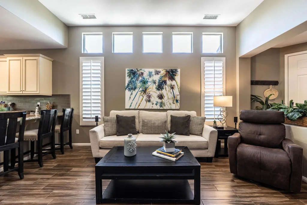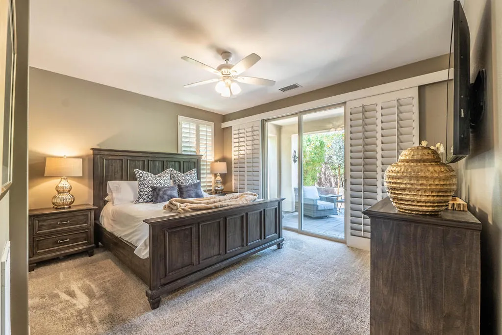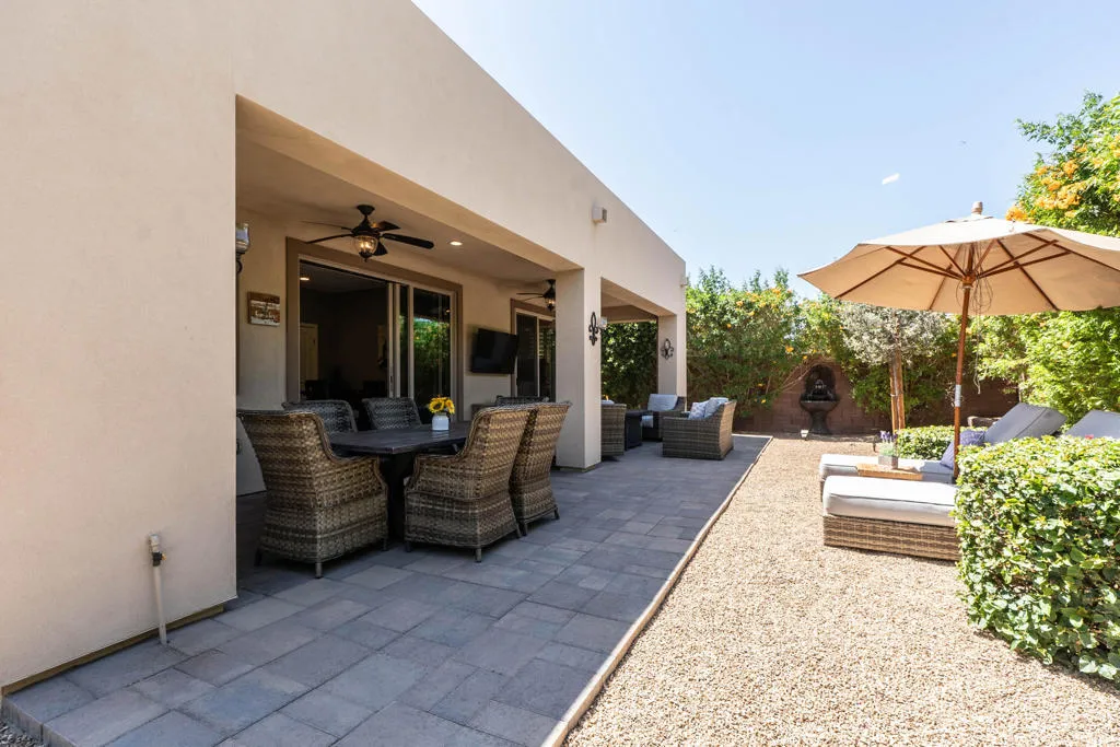 (Home Booked for 2026 Season ). Escape to Trilogy at the Polo Club, where modern design meets desert serenity. This stylish home offers 2 spacious bedrooms, 2 full bathrooms, and a cozy den with a sofa bed, perfect for accommodating up to 6 guests. Whether you’re here for relaxation or adventure, this home is an ideal base for your desert getaway.With 1,386 square feet of open concept living space, this home features beautiful tile wood floors throughout the common areas and large windows that invite natural light in, creating an airy and warm atmosphere. The contemporary design provides a fresh and inviting space that feels like home.The kitchen is fully equipped with all-new appliances, including a gas cook-top with a griddle and a convection/air fryer oven along with elegant granite countertops. Whether you’re preparing a simple meal or entertaining, this kitchen has everything you need to make cooking and dining a breeze.The master suite is a true retreat, offering a peaceful atmosphere with dual vanities and a walk-in shower. After a day of exploring, this space provides the perfect setting for relaxation and comfort.Step outside to your own private backyard, where you can unwind in peace. The covered patio features a BBQ and outdoor dining area, ideal for enjoying meals al fresco. Lounge in comfort with cozy outdoor chairs, enjoy a TV for watching the latest games or your favorite shows. The fire pit adds a cozy touch for evening gatherings under the stars and indulge in s’mores by the fire. The beautifully maintained desert landscape creates a calm, natural setting to relax in.With all the comforts of home and the beauty of the desert landscape, Trilogy at the Polo Club is the perfect getaway destination.