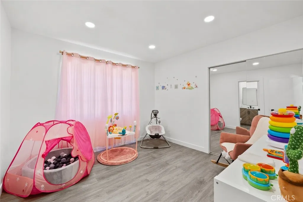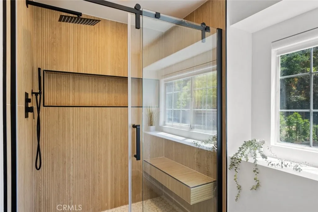 Additional features include LED recessed lighting throughout, copper plumbing, a newer roof and AC system, smart thermostat, and new sink fixtures. The dedicated laundry room is outfitted with new cabinets, a deep utility sink, and custom shelving. A large linen closet with a stylish barn door adds both convenience and charm.