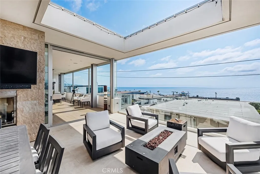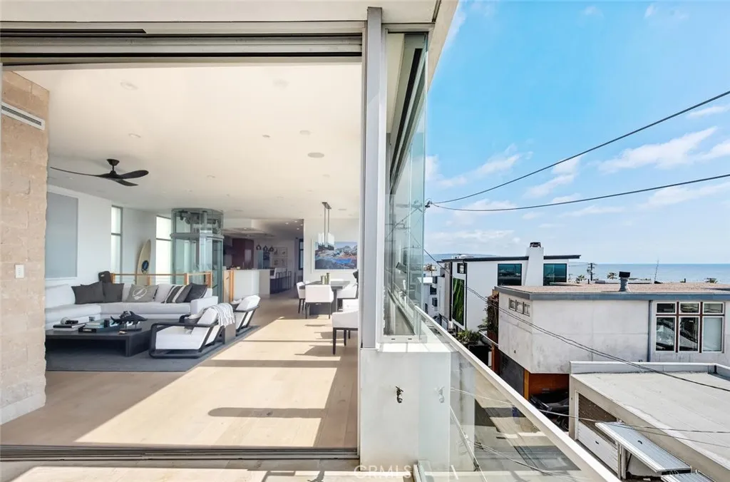 Set on a prominent corner walk street, this home boasts breathtaking, unobstructed ocean views stretching from Palos Verdes to Malibu, showcased through expansive floor-to-ceiling glass. The open-concept design emphasizes seamless indoor-outdoor living, with Fleetwood sliding doors, a tiered patio perfect for entertaining, and a signature all-glass elevator that serves as a dramatic centerpiece.