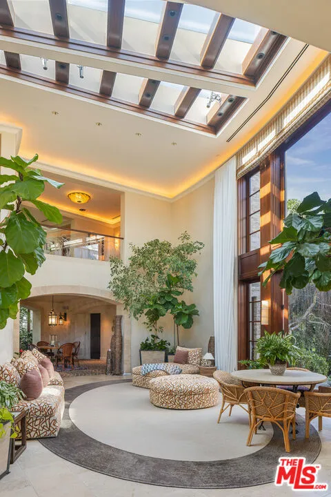 The Quincy Jones Estate – an extraordinary offering in prime lower Bel Air, sited on an approx. 2.3-acre promontory with sweeping 270-degree panoramic views. Custom built for one of the most iconic figures in music history, the estate is privately positioned behind gates at the end of a cul-de-sac, offering total seclusion with unobstructed vistas from the San Gabriel Mountains to the Pacific Ocean. A majority of the grounds are flat and usable, featuring a full-size lighted tennis court, circular motor court, rolling lawns, lush gardens, multiple verandas and patios, and an infinity-edge pool. Designed in collaboration with renowned architect Gerald “Jerry” Allison, FAIA celebrated for his global luxury hospitality work the residence was conceived as a personal retreat, merging resort-inspired design with bold scale and refined finishes. The circular central wing anchors the home, encompassing a grand living room with adjoining library, bar, and terrace. A sun-filled double-height atrium connects to a wine bar, tasting room, and cellar, flowing into an indoor garden. A game lounge and cabana open directly onto the pool terrace, completing the resort-style experience.The east wing houses the expansive primary suite – a private sanctuary with a luxe bedroom, spa-style bath, multiple walk-in closets, gym, den, and private balcony. This wing also includes a formal dining room, gourmet kitchen with butler’s pantry, family room, and staff quarters. The west wing features three additional guest suites, including a junior primary with its own living room, dual bathrooms, walk-in closet, and terrace. Additional amenities include a state-of-the-art screening room, a professional office with reception area, a dedicated security office, and a gallery. The home is serviced by an elevator and multiple staircases, one in each wing. With a rich cultural legacy, this iconic estate has welcomed Hollywood royalty, global dignitaries, and legendary artists. Just minutes from Sunset Boulevard, it stands as one of the most exceptional view estates in all of Los Angeles offering rare privacy, pedigree, and scale.
