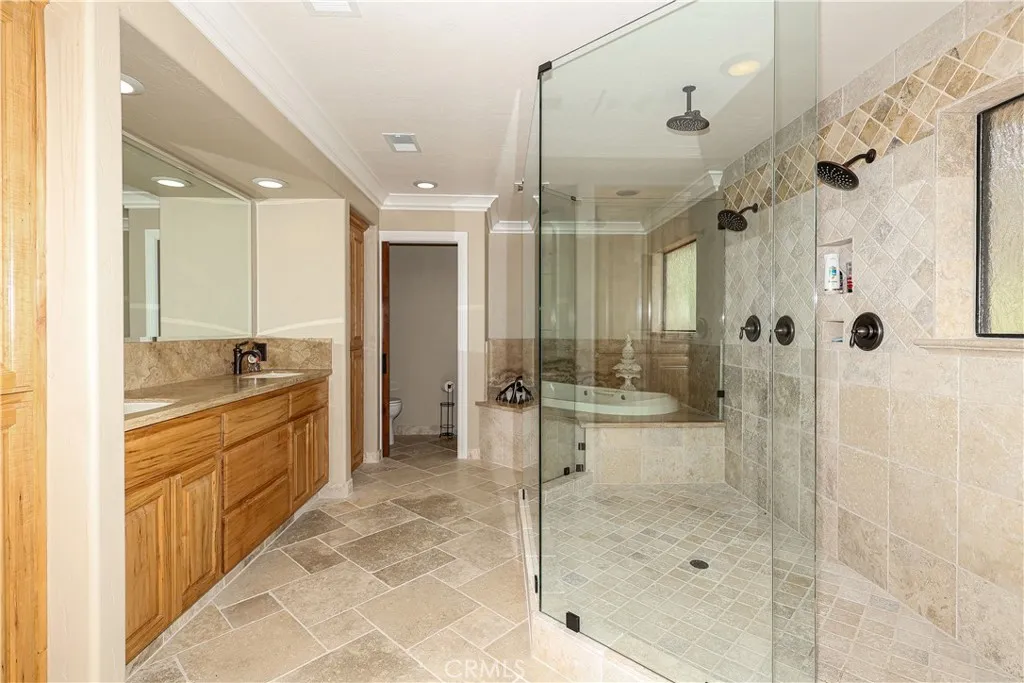 From beautiful HARDWOOD & TRAVERTINE FLOORS, gorgeous GRANITE COUNTERS & backsplash, copper sinks, stunning granite in the showers, DUAL SHOWERHEADS, 3 FIREPLACES and tons of storage! Also includes an ADDITIONAL ROOM/LIVING SPACE ABOVE GARAGE. Huge cedar deck in front & the backyard features another deck, stone walls and pillars, tiered landings along with paved meandering paths along the hillside. This property is perfect for HOSTING and ENTERTAINING LARGE GROUPS.