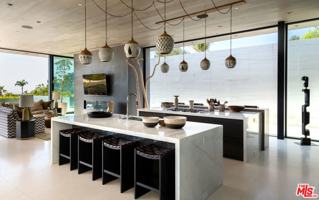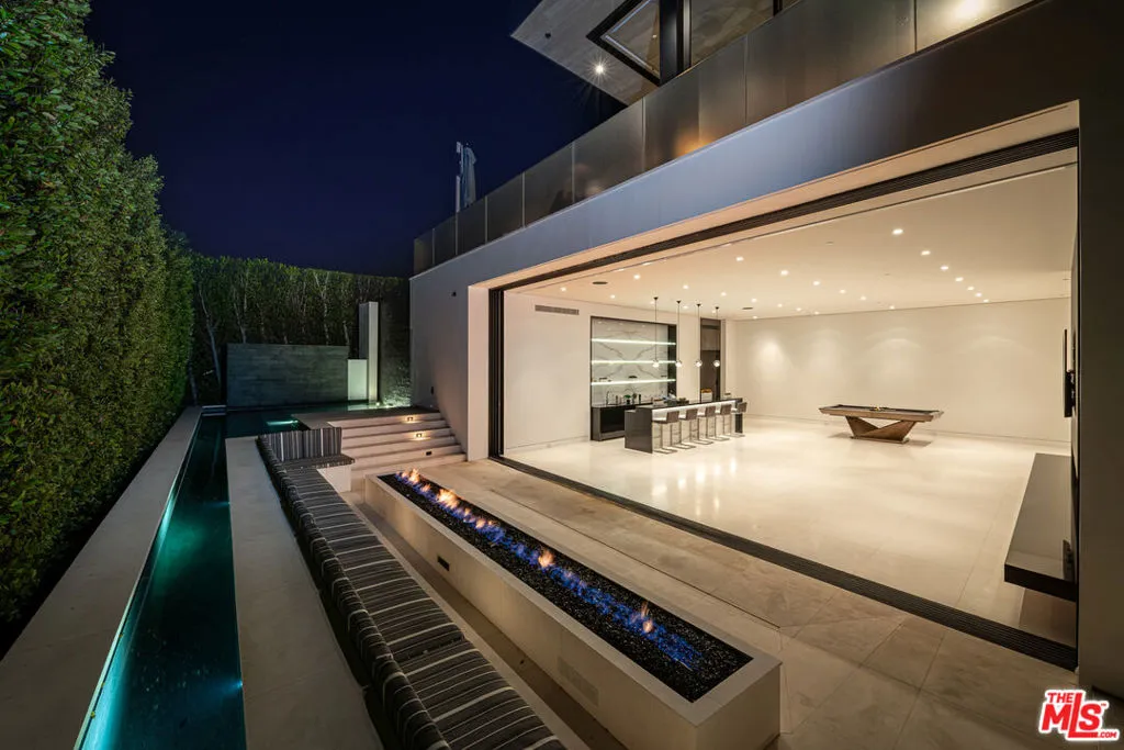 Soaring above Sunset Blvd with jetliner views from Century City to the pacific ocean, this furnished modern showcases breathtaking unparalleled views of Los Angeles. This home boasts 12-foot ceilings, floor to ceiling windows, multiple water features, car museum and a 70-foot book-matched marble exterior wall for ultimate privacy. The open-plan living areas take you through expansive Fleetwood doors leading you to the sun-lit deck and infinity pool. Chef’s style kitchen and primary suite with spacious walk-in closet and master bath on main level. Second suite with optional second entrance on main level. A daylit entertainer’s level holds 2 additional en-suite bedrooms, a great room with custom bar, 18 seat screening room, fitness room with steam, and a lounge space. With full Crestron automation, this home offers a living experience moments to the Beverly Hills Hotel and Rodeo Drive. Please inquire with agent about available concierge services for an extra fee.