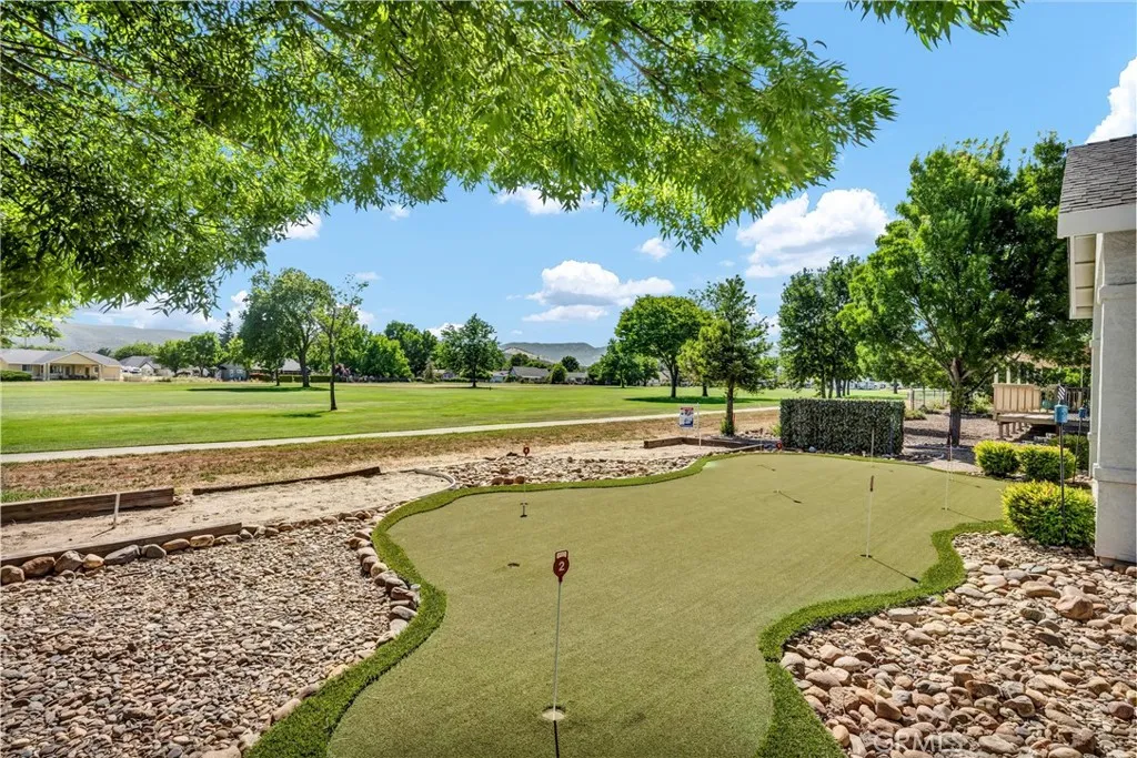 HUGE REDUCTION!! PRICED TO SELL! Situated on the 3rd Fairway at Hidden Valley Lake’s Championship Golf Course, this 3 bed / 2 bath single level home offers 1,807 SF of spacious living space. Beautiful stucco home with new exterior paint and low maintenance landscaping will catch your eye from the road. Large level driveway with plenty of room for parking + a 3 car garage for your vehicles, golf cart or storage! The tiled entry leads to the spacious living room with vaulted ceilings and new vinyl plank flooring. Stately propane fireplace with brick hearth is a nice focal point in the space. The kitchen is open to the living room with a center island, tiled countertops and loads of storage cabinetry. Dine at the breakfast bar, dining nook or formal dining room off the entry. Desirable separation floorplan with 2 guest bedrooms & bathroom on one end with primary and full laundry room with utility sink on the other. Access the back patio from the living room or the primary bedroom. The views from the covered patio of lush green grass year round with surrounding hills in the distance will never get old! Up for some competition? A custom 9 hole putting green with fringe for chipping or the built-in horseshoe pit provides endless outdoor entertainment! The primary bedroom has plush carpet, a ceiling fan and an ensuite bathroom with large walk-in closet + built-ins, new vinyl plank flooring, large walk-in shower, soaking tub and dual sink vanity. This well maintained home shows pride of ownership, add it to your list today!